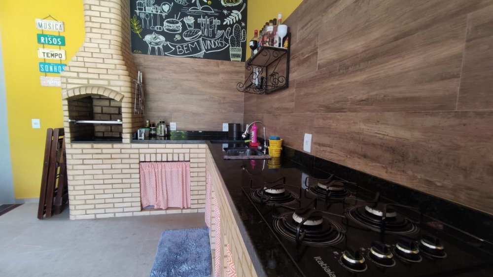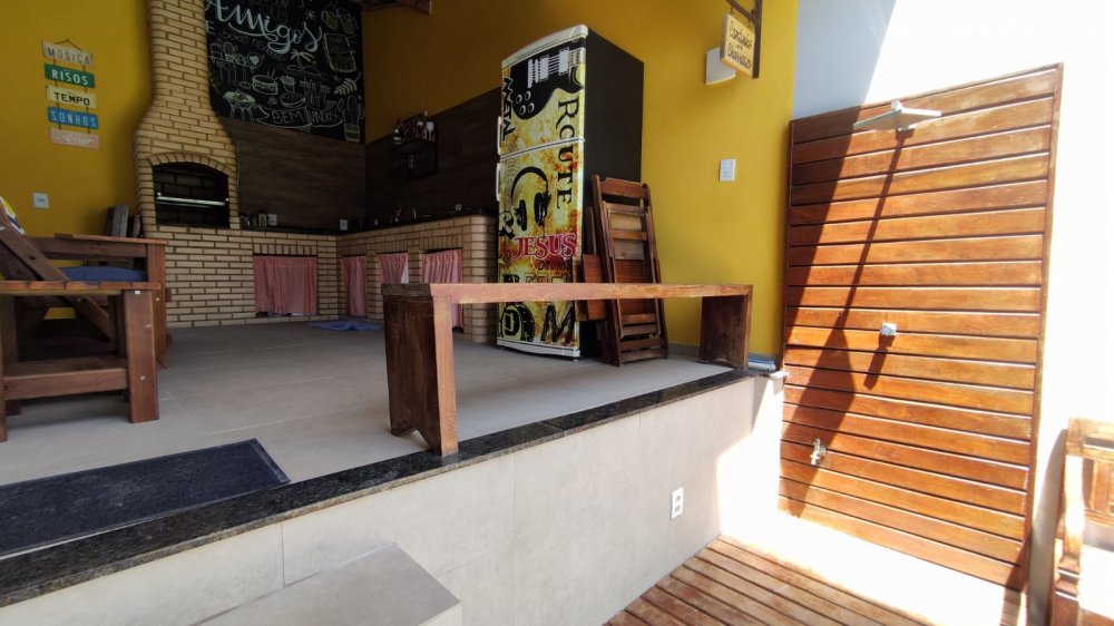 Área Gourmet com churrasqueira, fogão, geladeira, banco/mesa e conjunto de cadeiras.