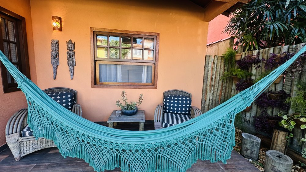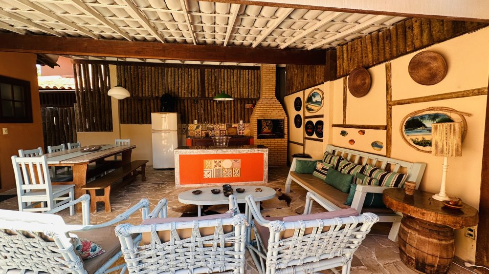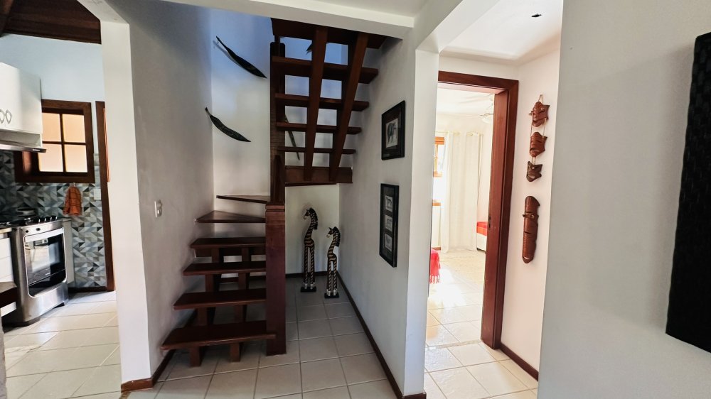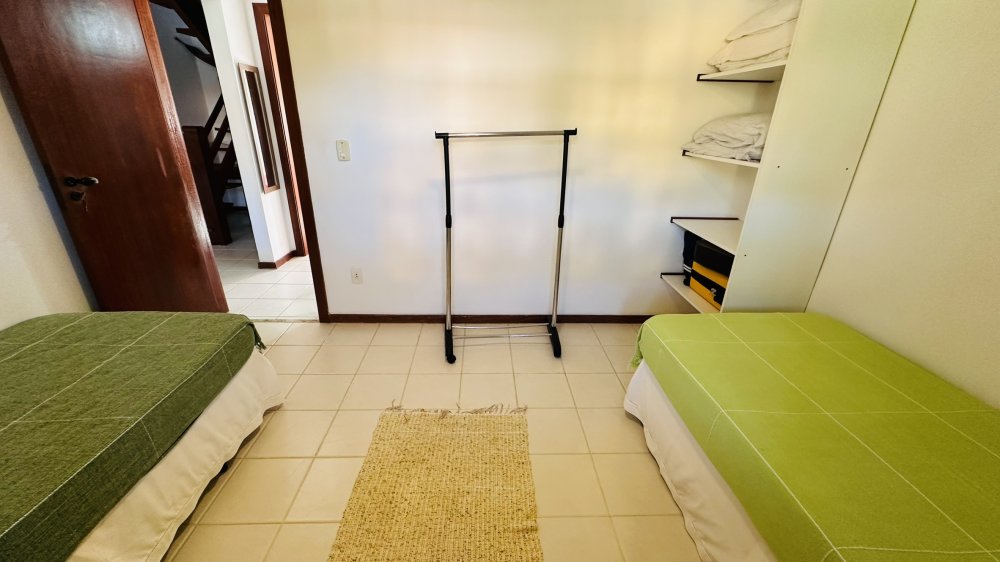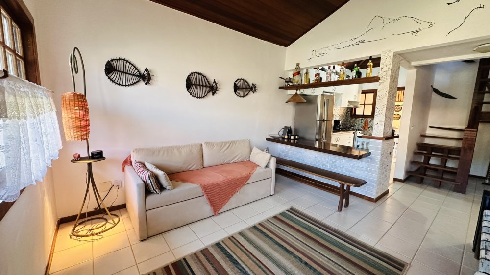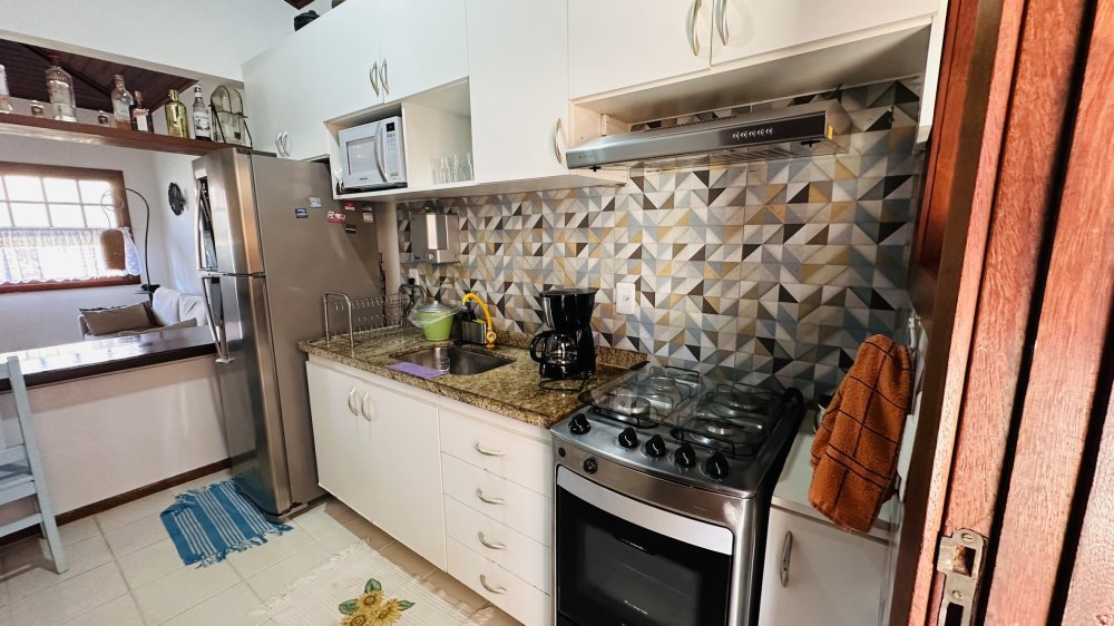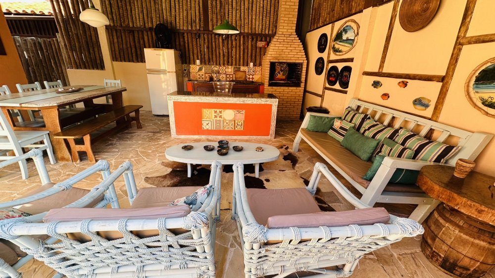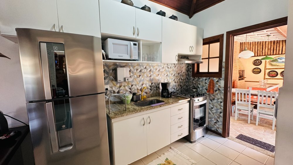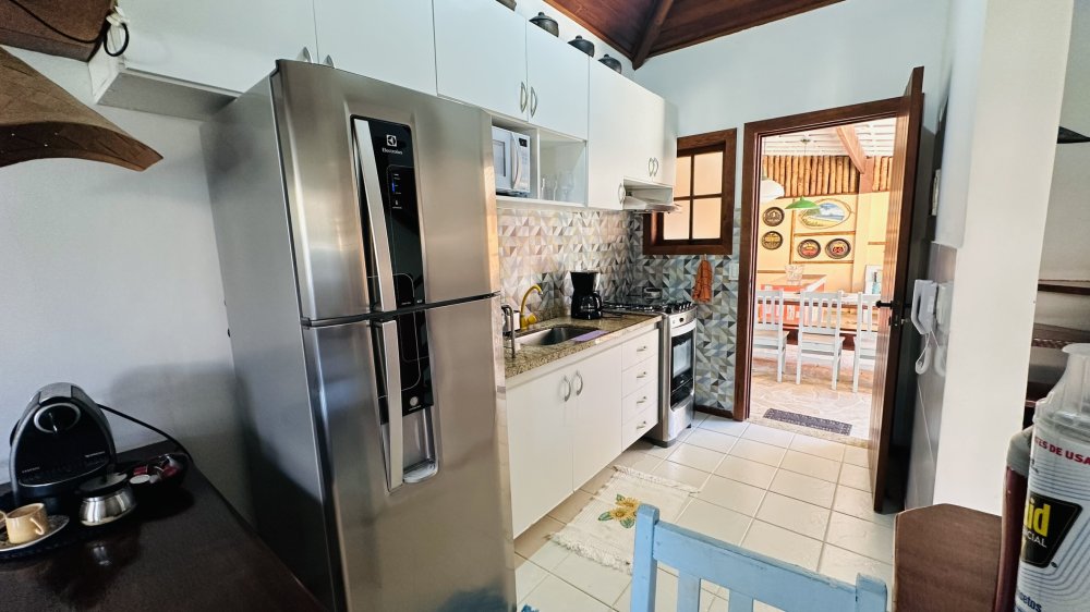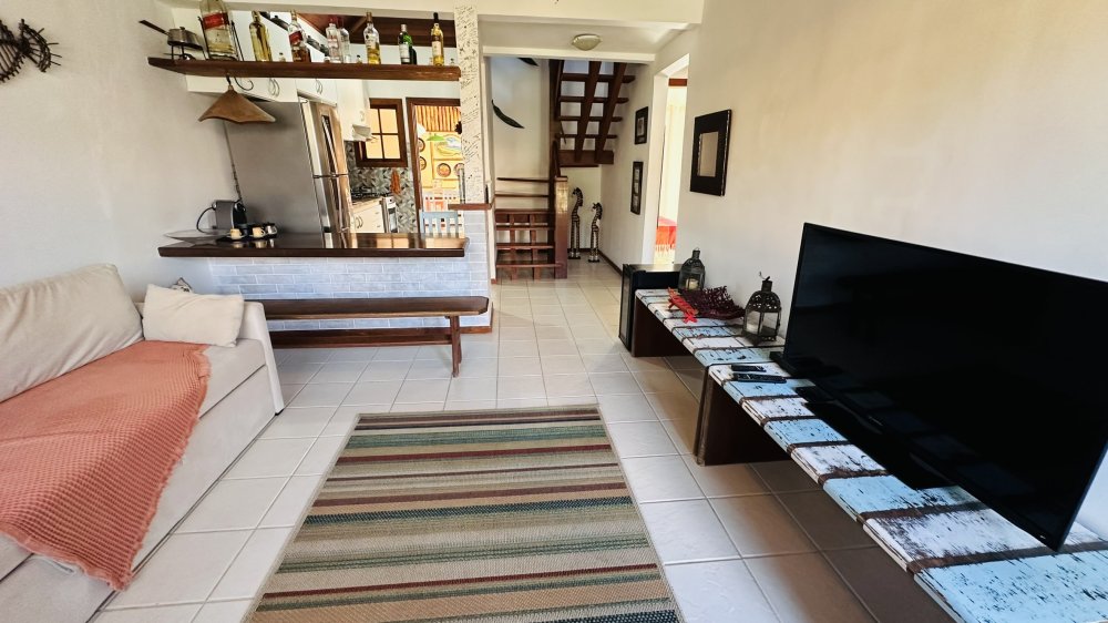 Casa praiana completamente mobiliada, com churrasqueira, chuveirão, mesas, sofa e lavabo na parte de trás. Condominio fechado e seguro. Imovel com  dois andares, sendo no andar de cima a suite principal e no de baixo dois quartos com duas bicamas cada um que podem ser organizadas como na foto ou organizar em 2 camas de casal. Cozinha completa com sala e varanda na frente da casa.
