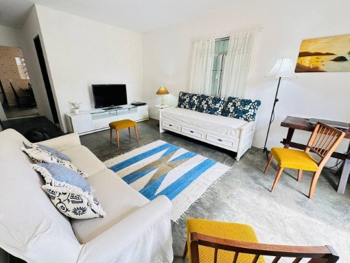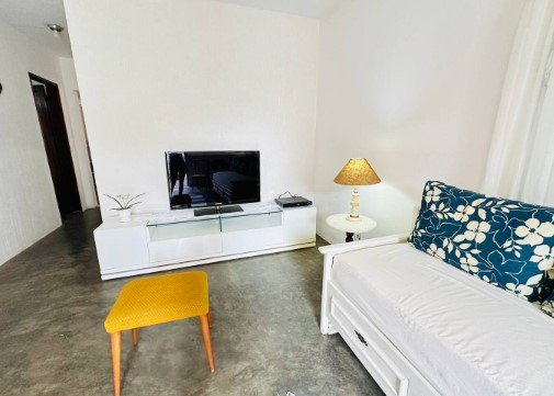 - Sala com sofá que pode acomodar uma pessoa dormindo