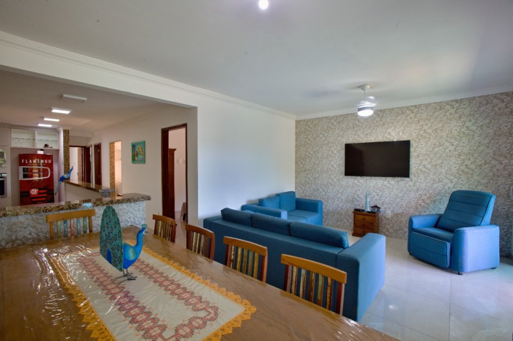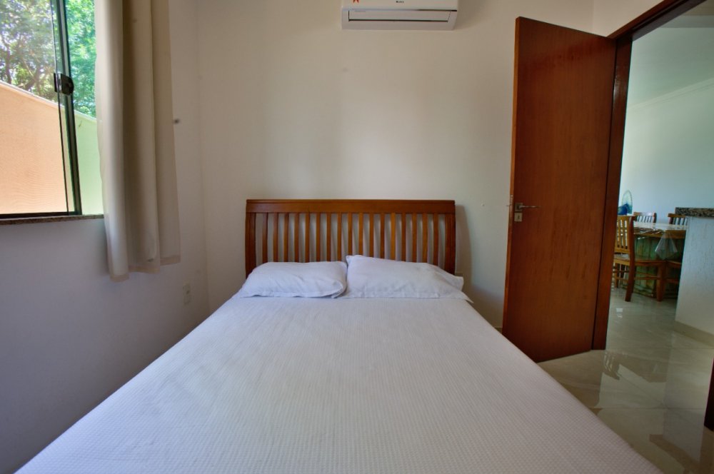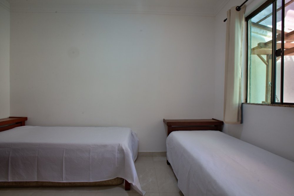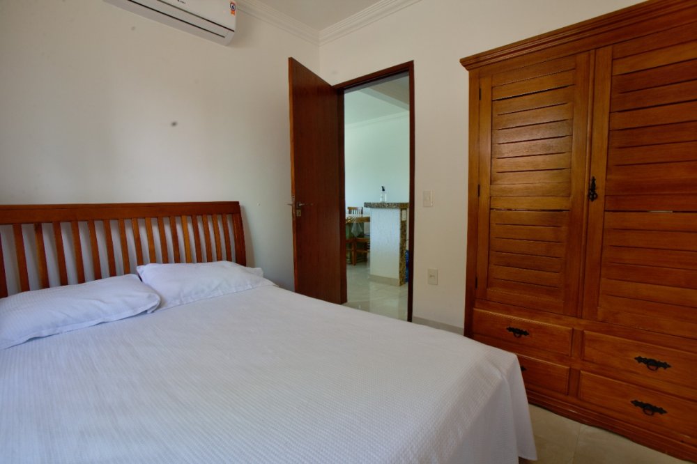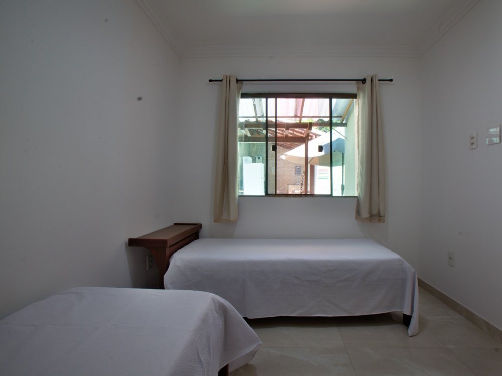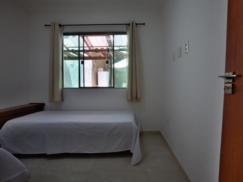 Casa térrea composta de 03 quartos, sendo 01 suíte com ar condicionado e cama King e um sofá cama. No quarto social 01 temos uma cama de casal e 01 pequeno guarda roupa e ar condicionado. No quarto social dos fundos temos 02 camas de solteiro e 02 colchões solteiro, com ar condicionado A casa tbm possui um banheiro social