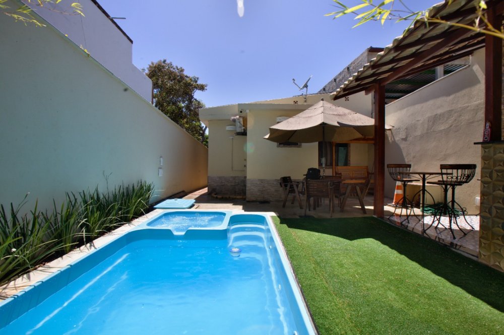 Do lado de fora da casa há 01 vaga para automóvel, caso vem com mais deixar na calçada em.frente a casa, o bairro é tranquilo e a casa possui sistema de câmeras. Nos fundo da casa, área externa temos uma piscina com hidromassagem, ducha, lavabo,.mesa com.04 cadeiras e 01 churrasqueira com pia.