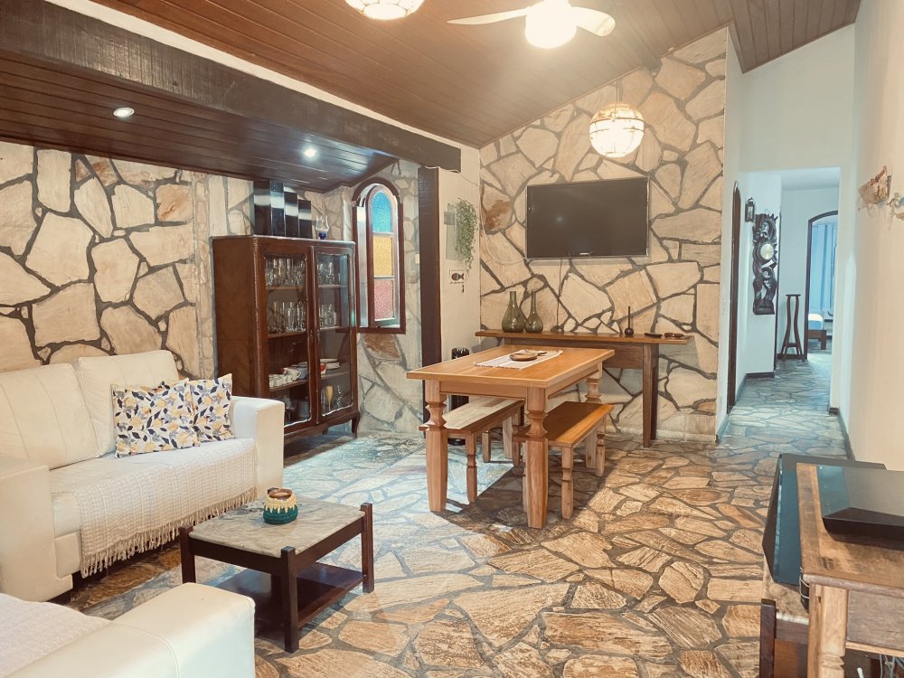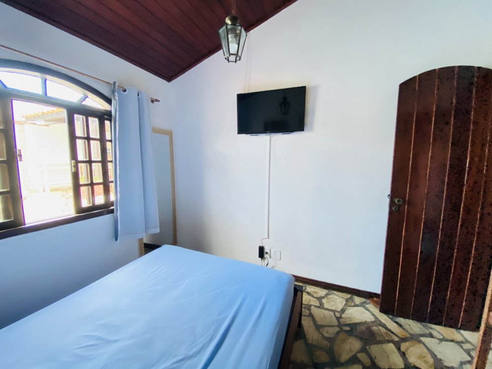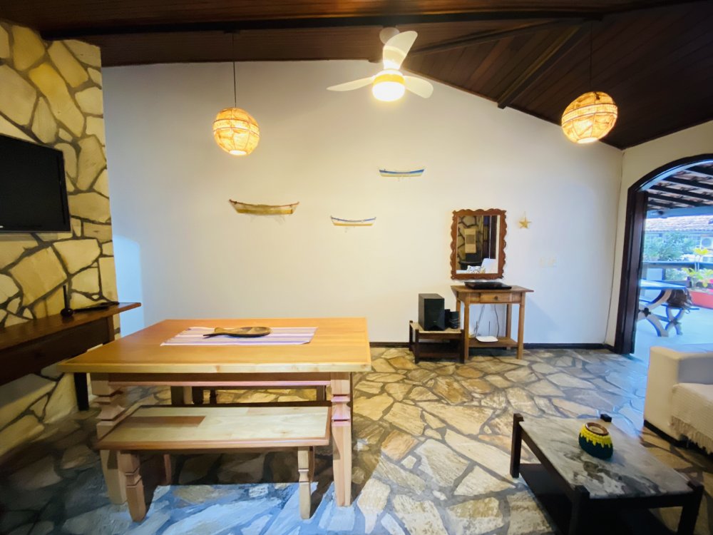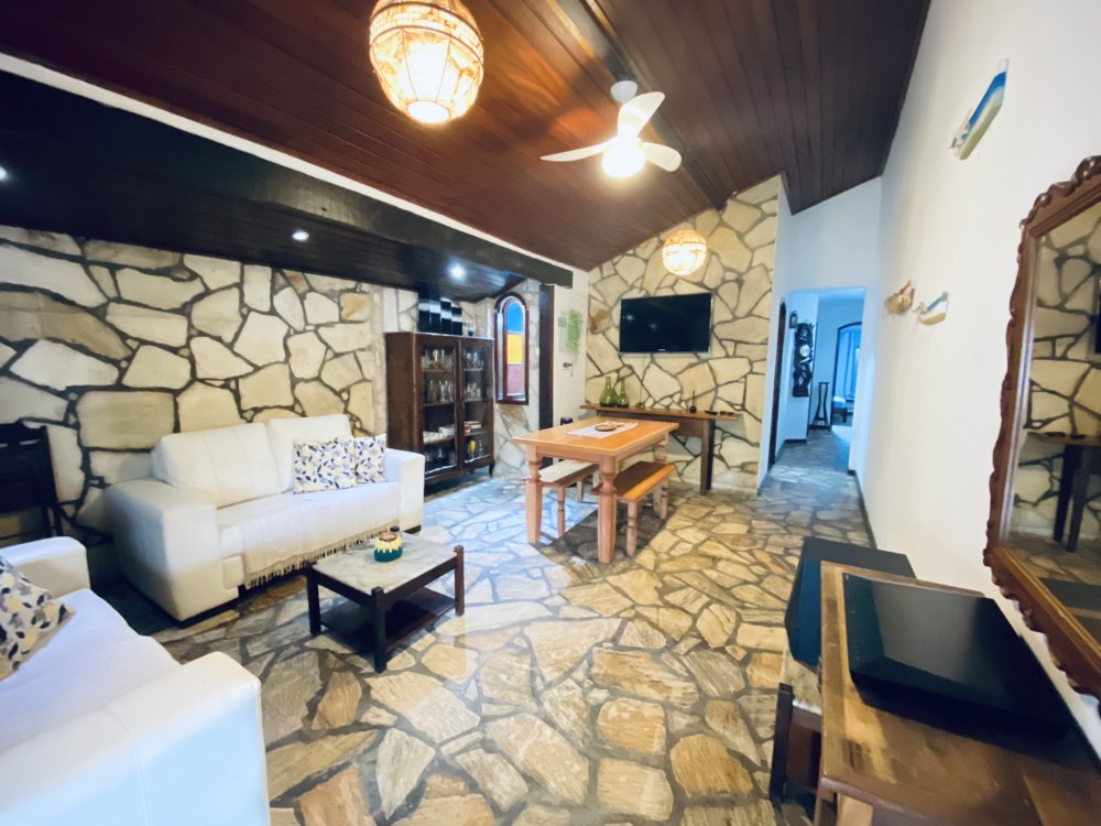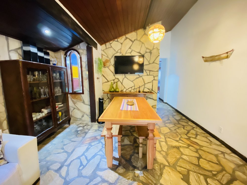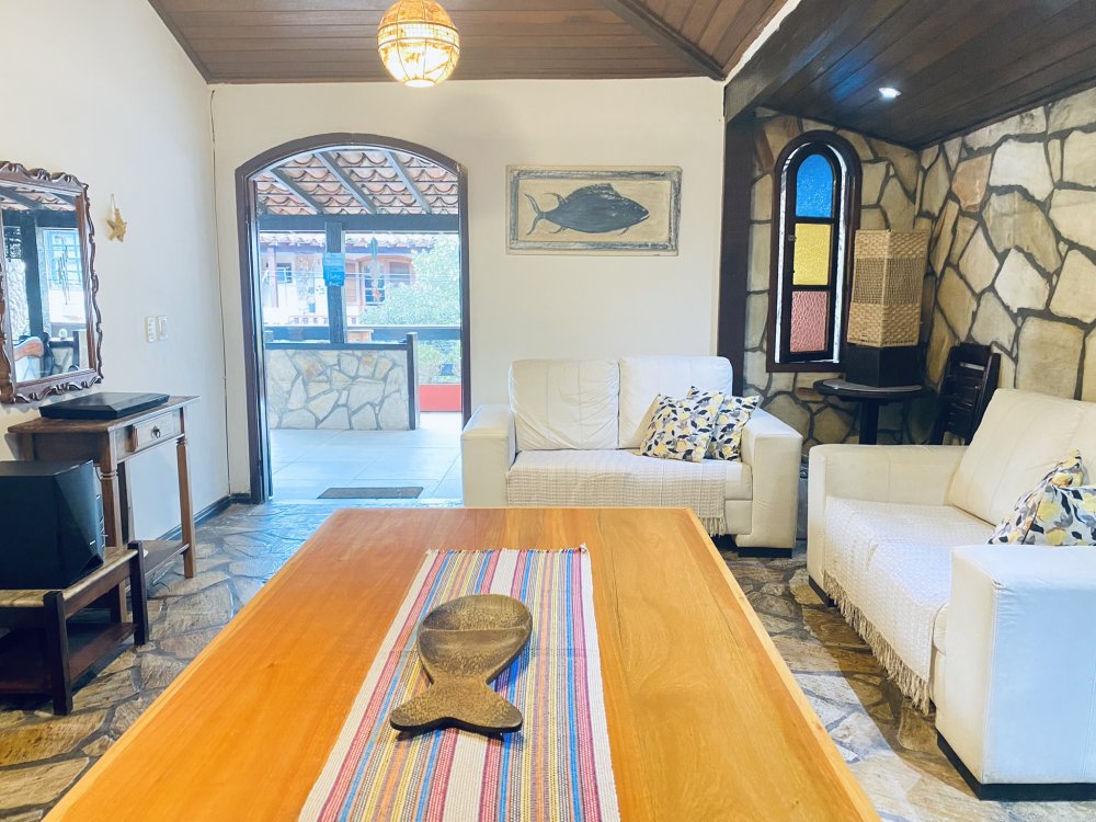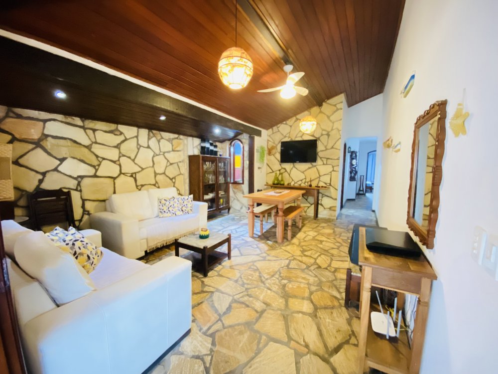A casa possui ampla varanda com vista para a Rua das Pedras e a Praça Santos Dumont, uma área de lazer nos fundos com churrasqueira, piscina e chuveiro. São quatro suítes equipadas com Tv e ar condicionado, uma sala de estar com TV, dois sofás, cozinha toda equipada, quarto no mezanino, lavanderia coberta e um lavabo.