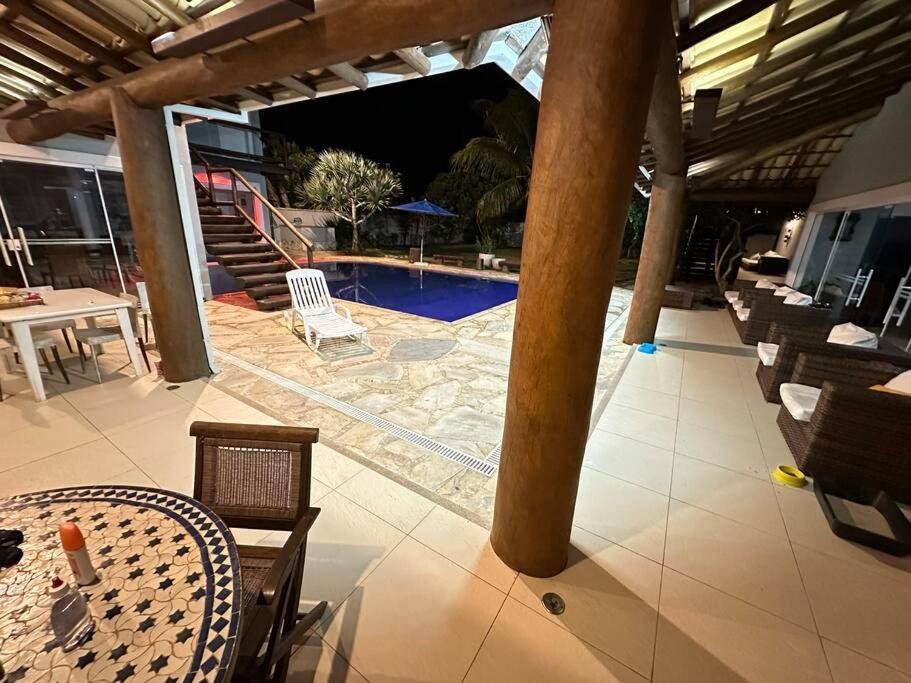 Área Externa: Piscina, chuveirão, lavabo, churrasqueira, geladeira para bebidas, mesa e cadeiras, sofás.