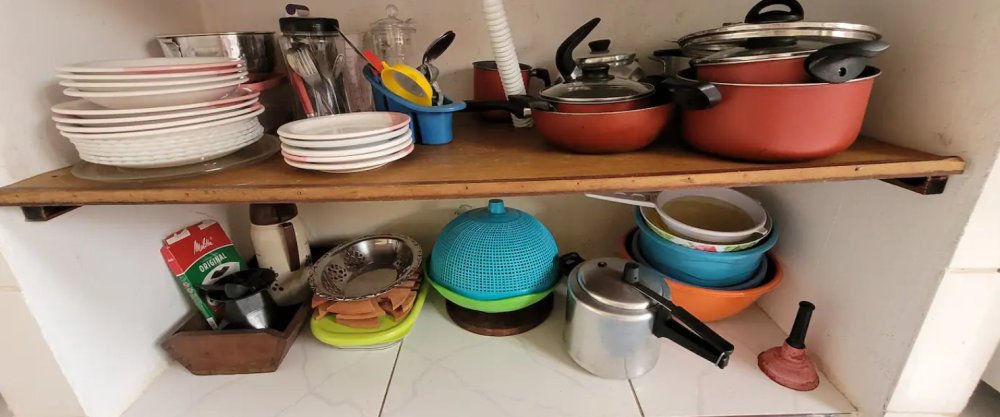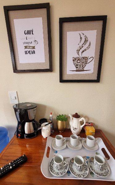 Na cozinha temos utensílios como liquidificar, sanduicheira, cafeteira (cantinho do café), pipoqueira, taças para vinho, copos de cerveja, panelas, panela de pressão, forma para bolo, garrafão de água, entre outros.