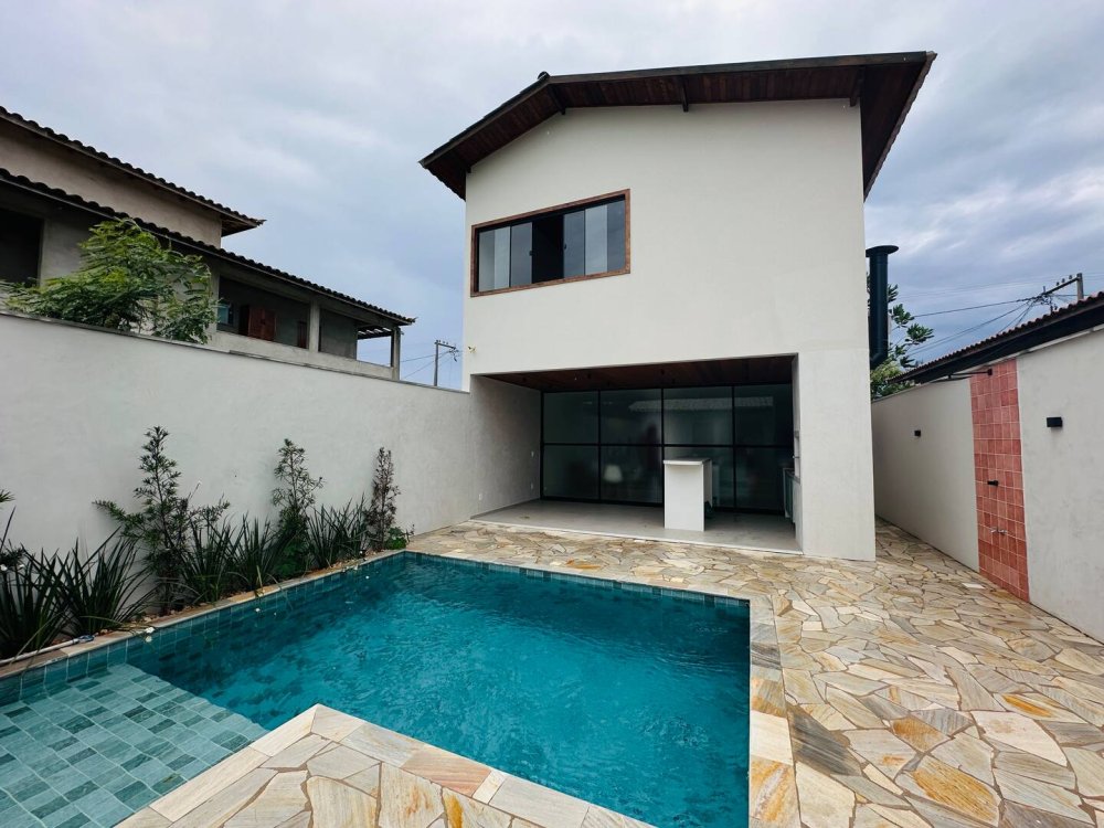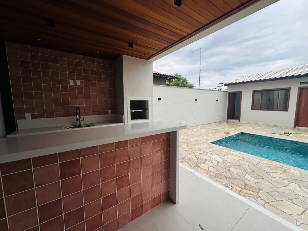 Casa conta com uma piscina refrescante e área de churrasqueira para momentos de lazer.