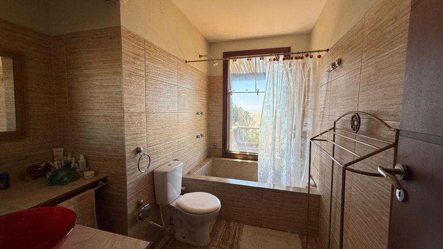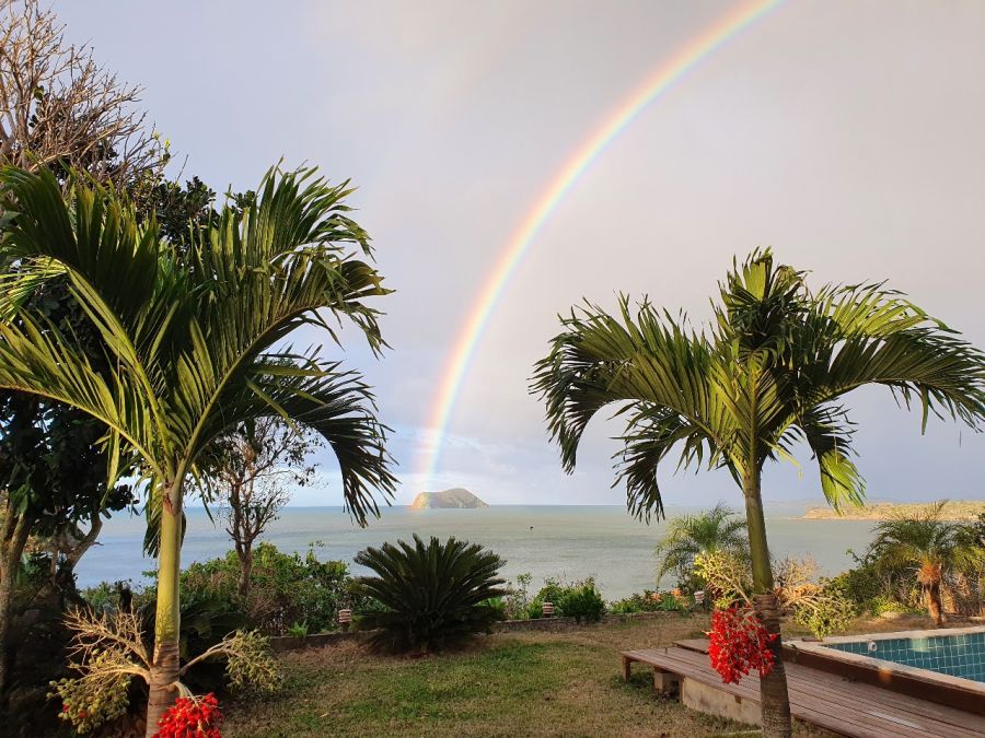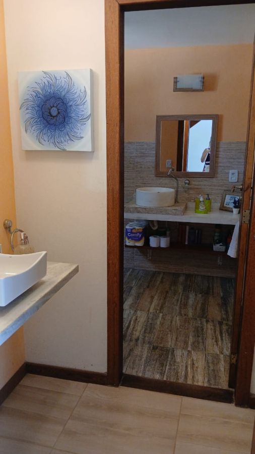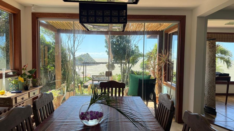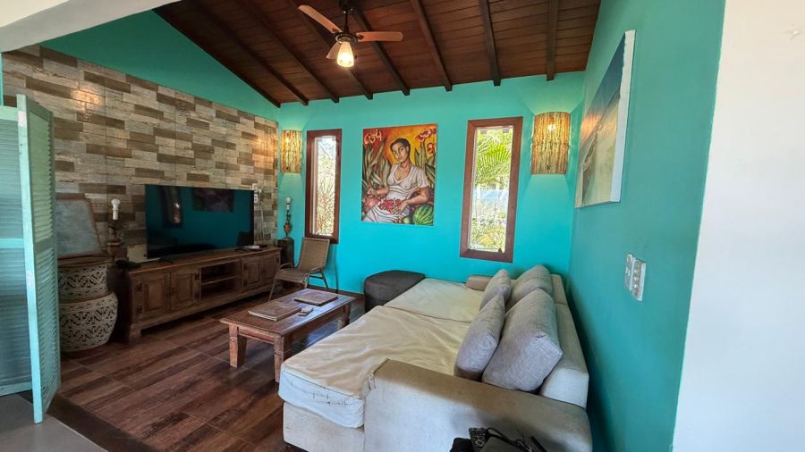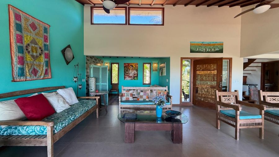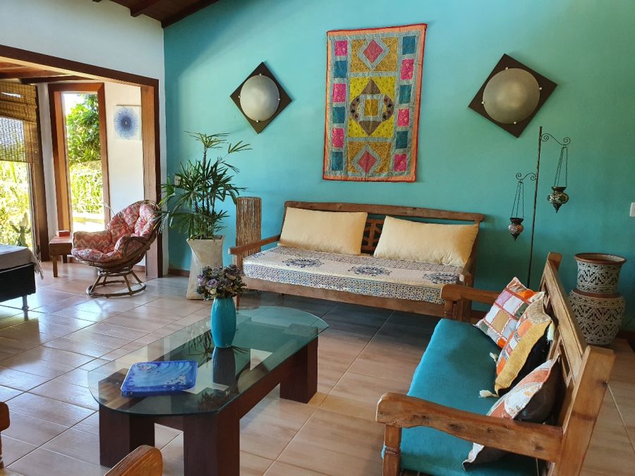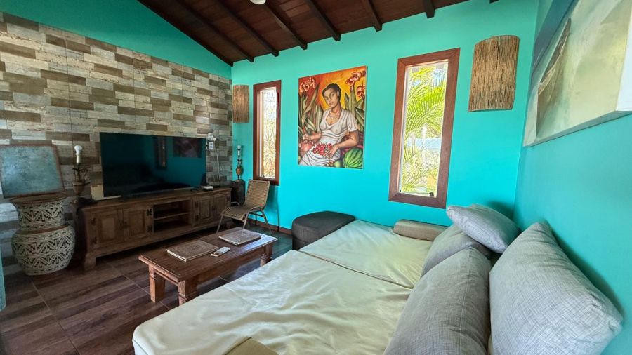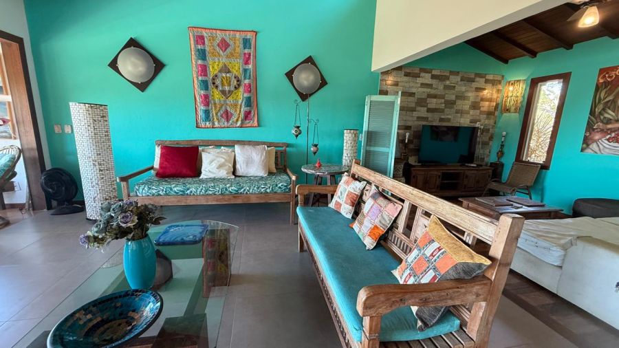 - 2 salas amplas com ventilador de teto, onde existe a possibilidade de colocar mais 1 cama de casal ( separada por um biombo), 1 banheiro completo, sala de estar com Tv, area de jantar e cozinha americana, todos os comodos do terreo tem vista para o mar!