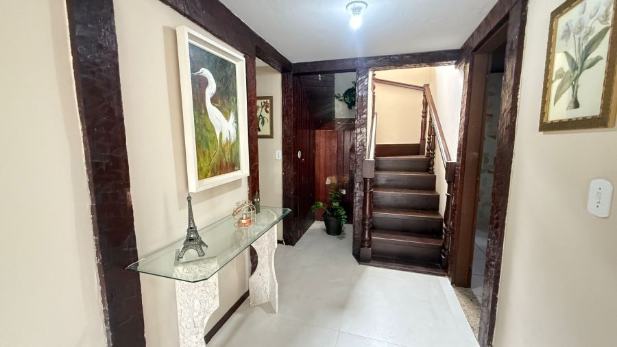 Casa conta com uma piscina refrescante com hidromassagem e área de churrasqueira com forno a lenha, para momentos de lazer.