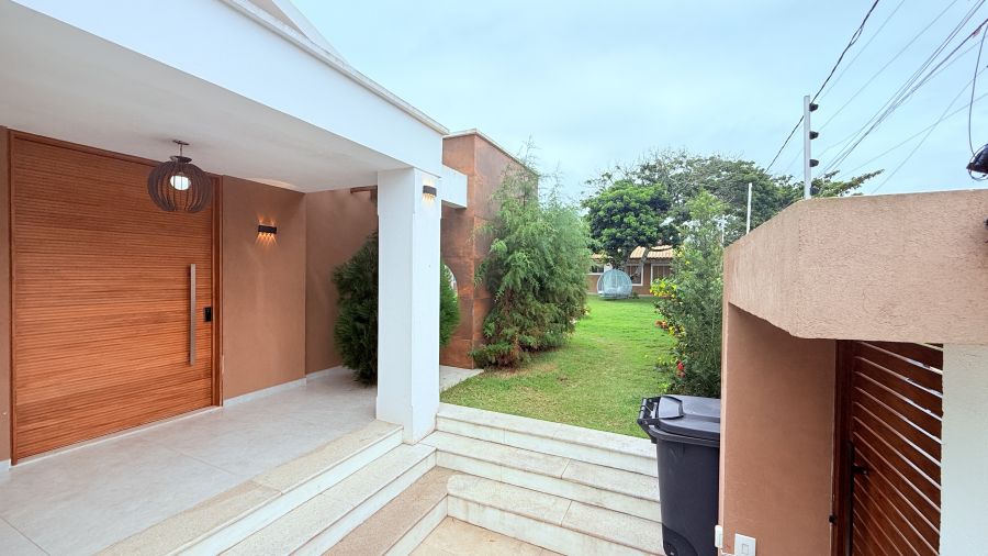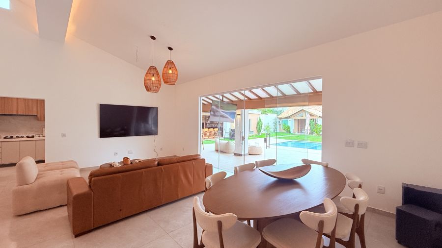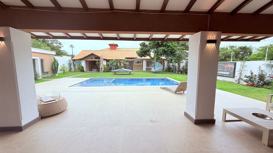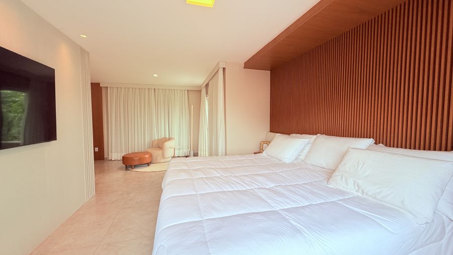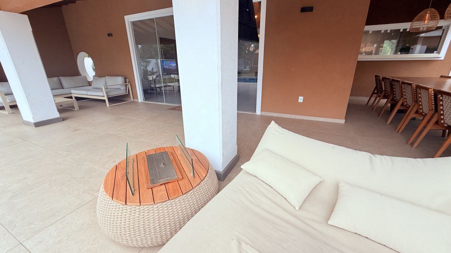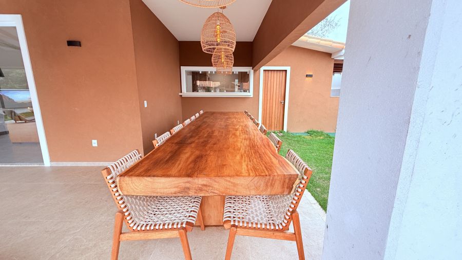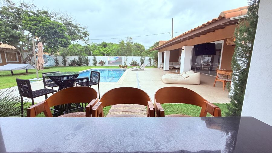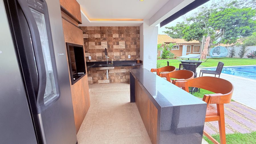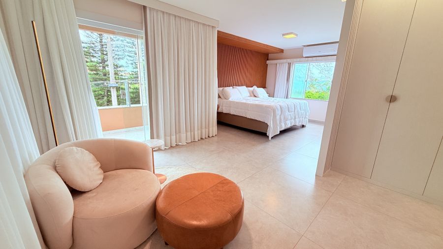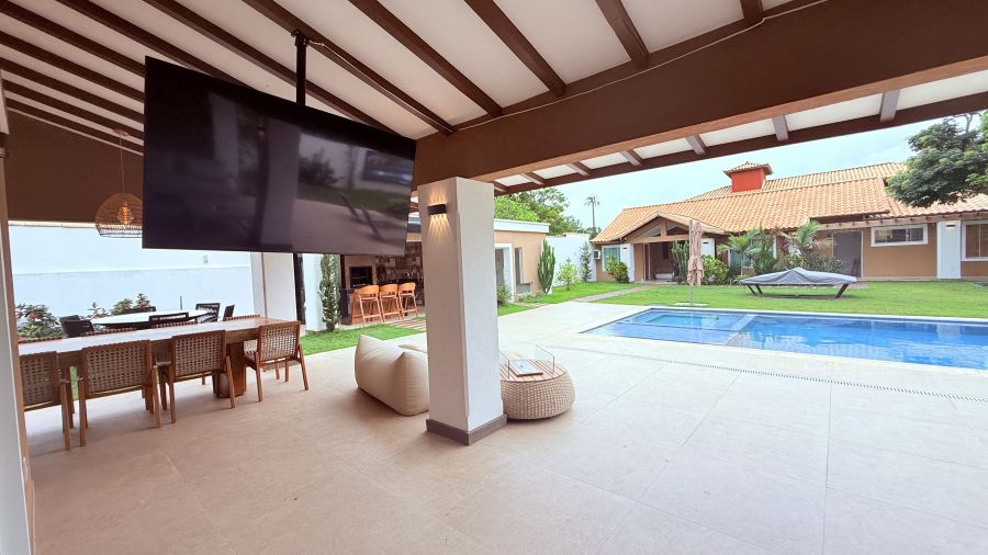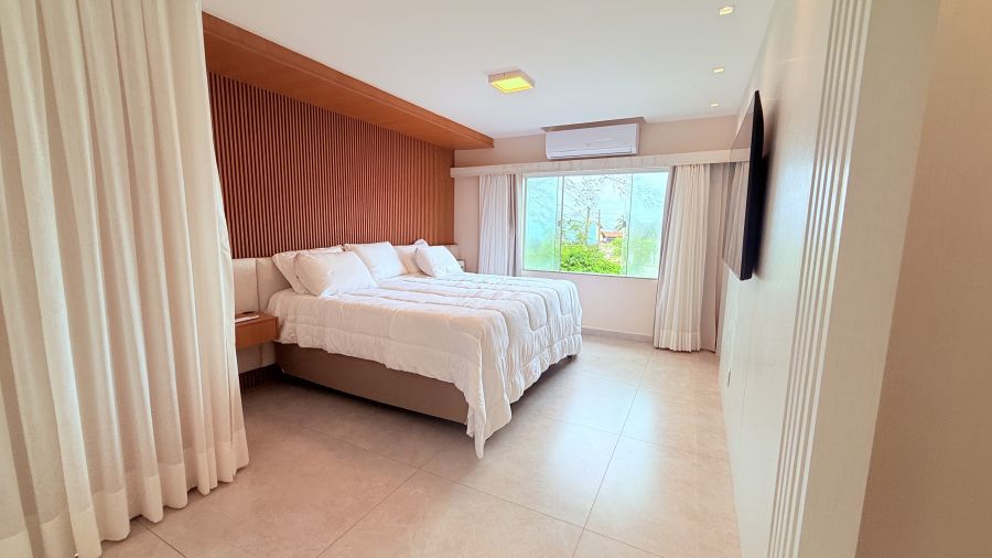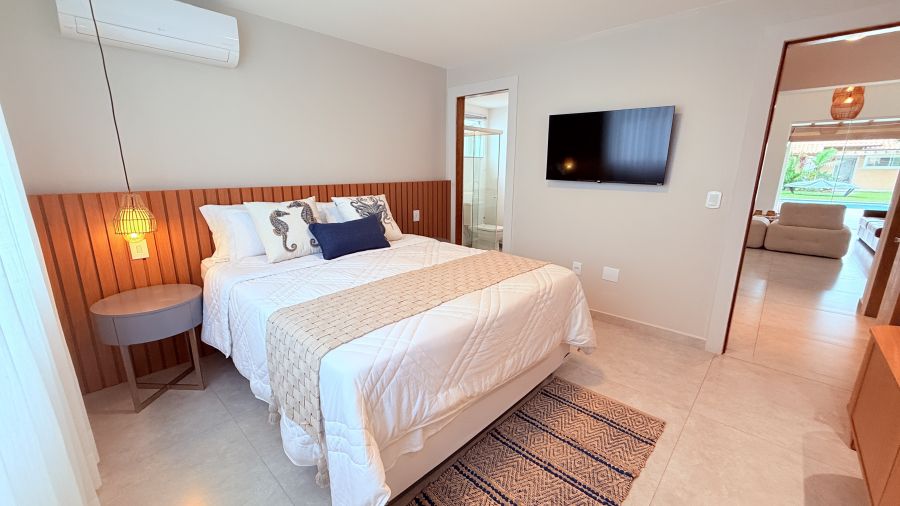 Esta elegante acomodação é ideal para grupos de até 16 pessoas. Localizada a apenas 5 minutos da praia, a casa oferece 6 suítes com ar condicionado, roupas de cama e banho , sala de TV, cozinha, piscina e área gourmet. Além disso, possui sistema de segurança 24 horas e será alugada com serviço de arrumadeira. P/ momentos de lazer, a casa oferece bike ergométrica, futmesa, piscina c/ aquecedor, telão, sauna e hidro. O estacionamento pode acomodar até 3 carros e a rua é tranquila , monitorada.