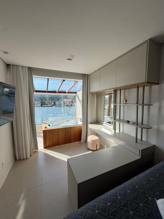 A casa é privativa, aconchegante, design moderno com piscina e área gourmet de frente ao lago, Sala ampla, jardim;