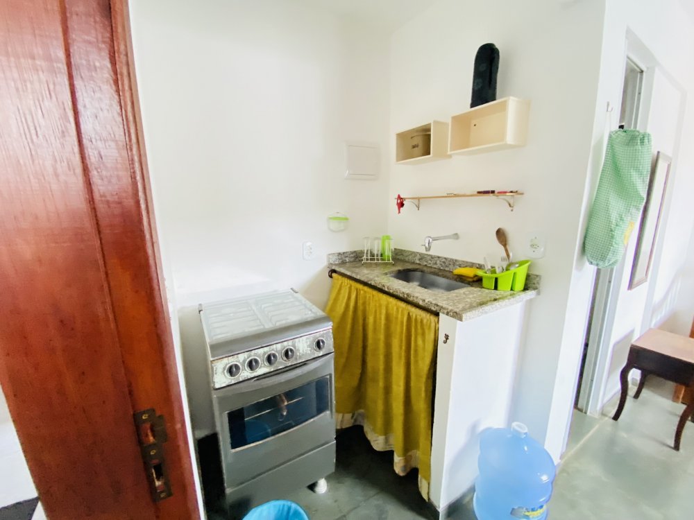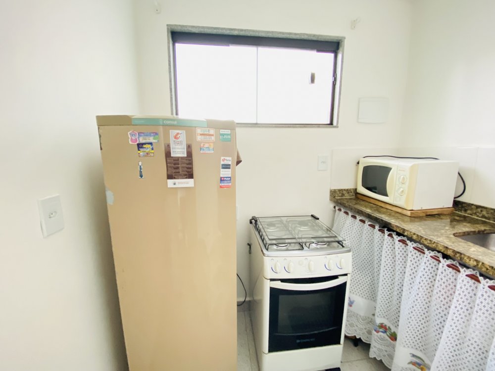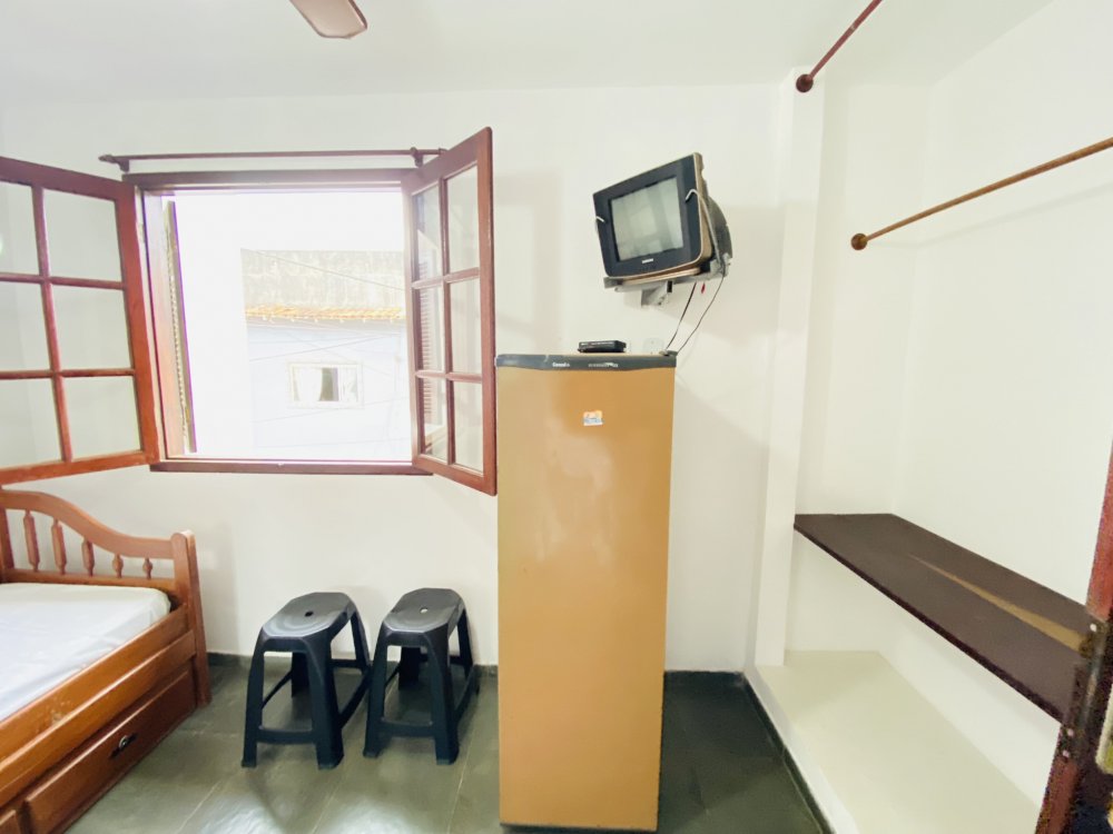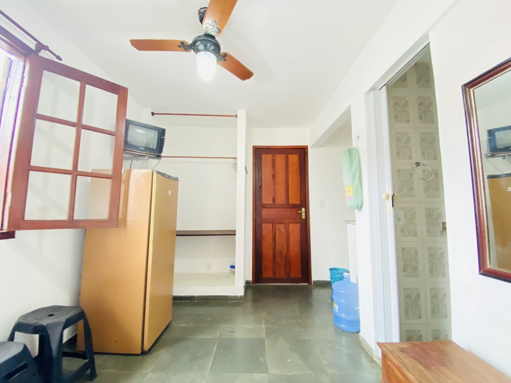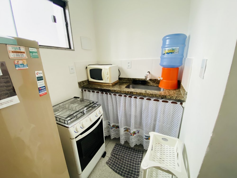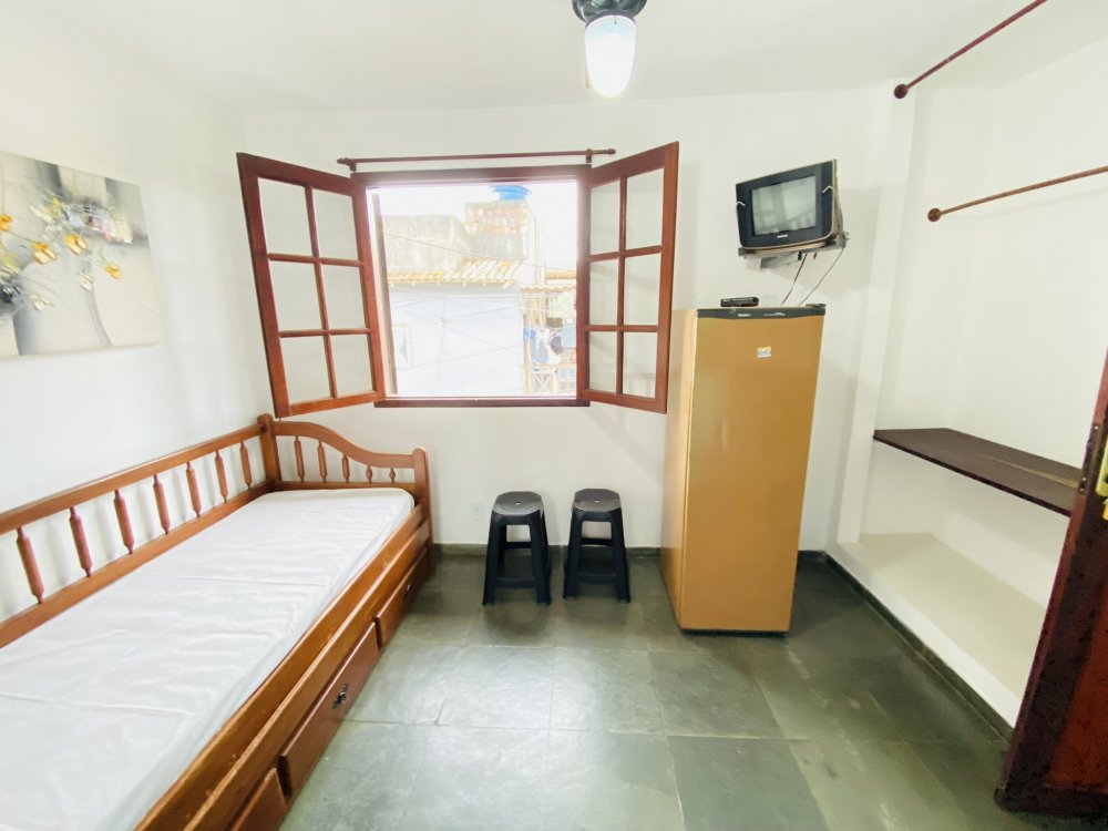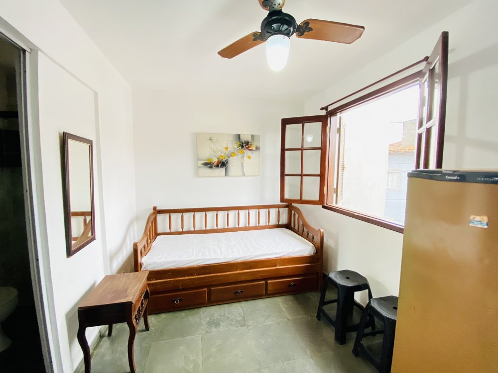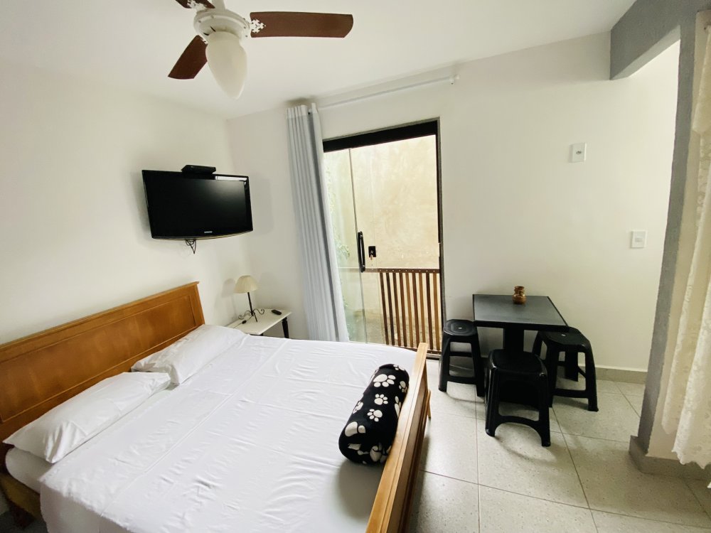 Pequeno Studio, piso frio, com 1 cama de casal, 1 beliche, tv e ventilador de teto. Cozinha integrada com geladeira, fogão, utensílios básicos, microondas. Banheiro confortável e reformado, com chuveiro elétrico, box com blindex. Wi Fi