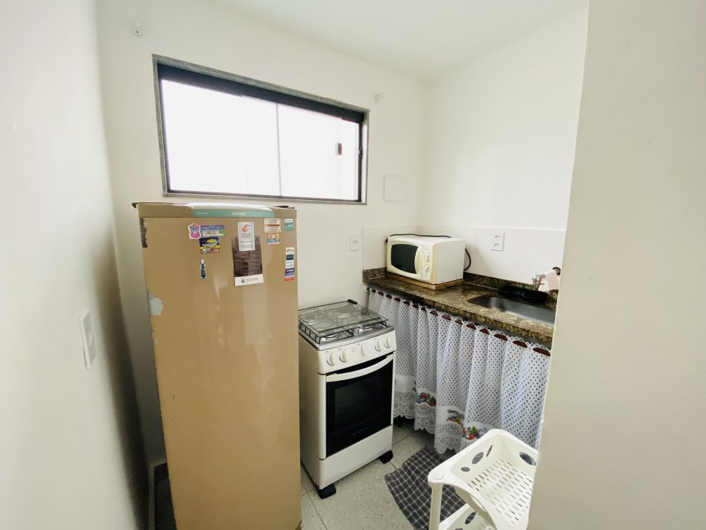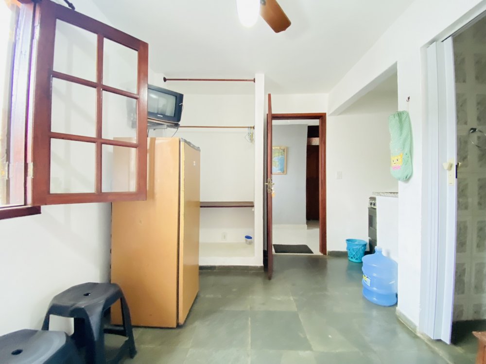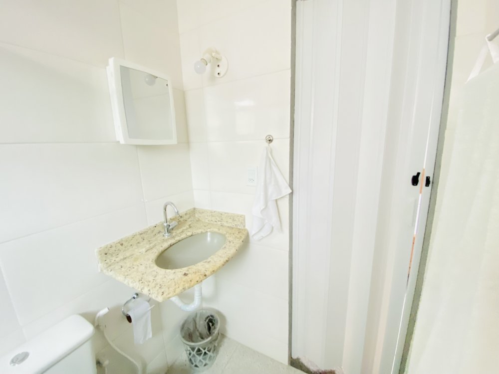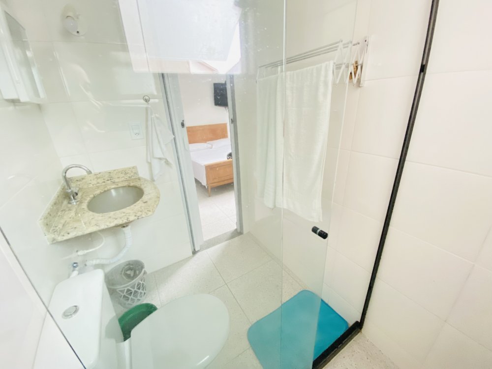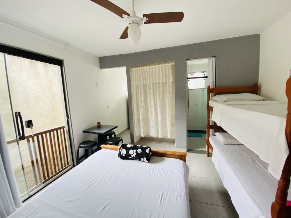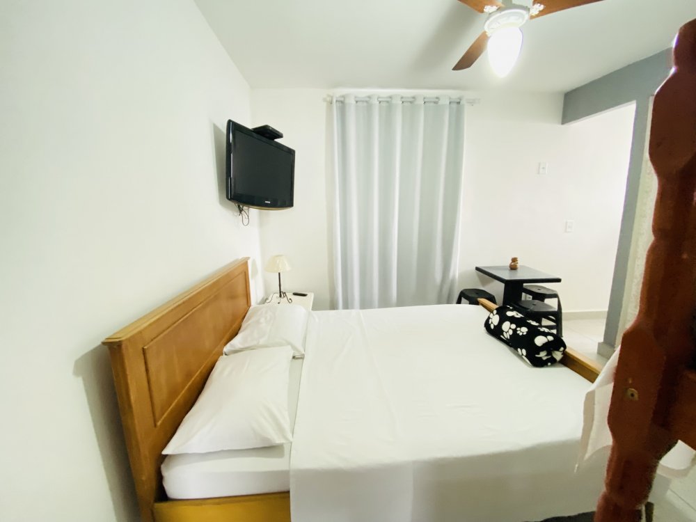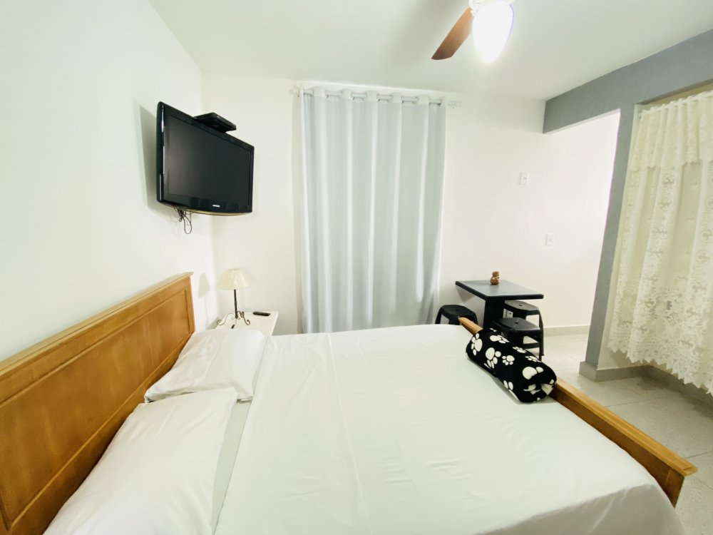 Pequeno Studio, piso frio, com 1 cama de casal, 1 beliche, tv e ventilador de teto. Cozinha integrada com geladeira, fogão, utensílios básicos, microondas. Banheiro confortável e reformado, com chuveiro elétrico, box com blindex. Wi Fi