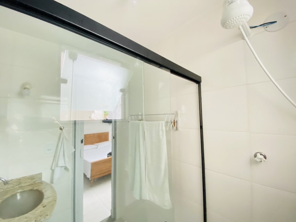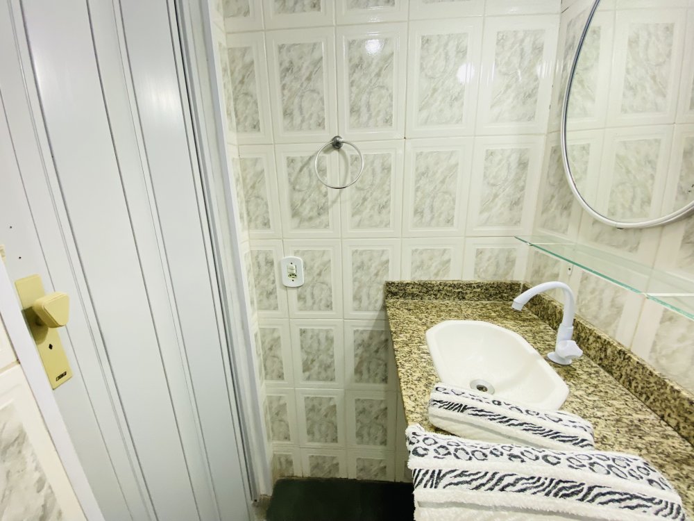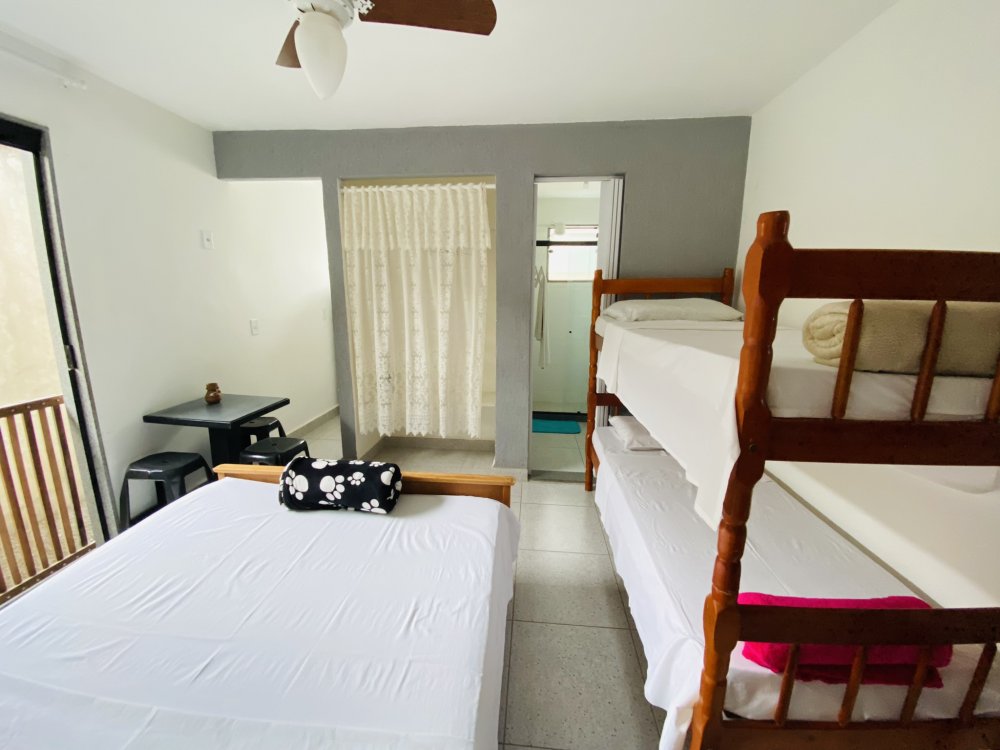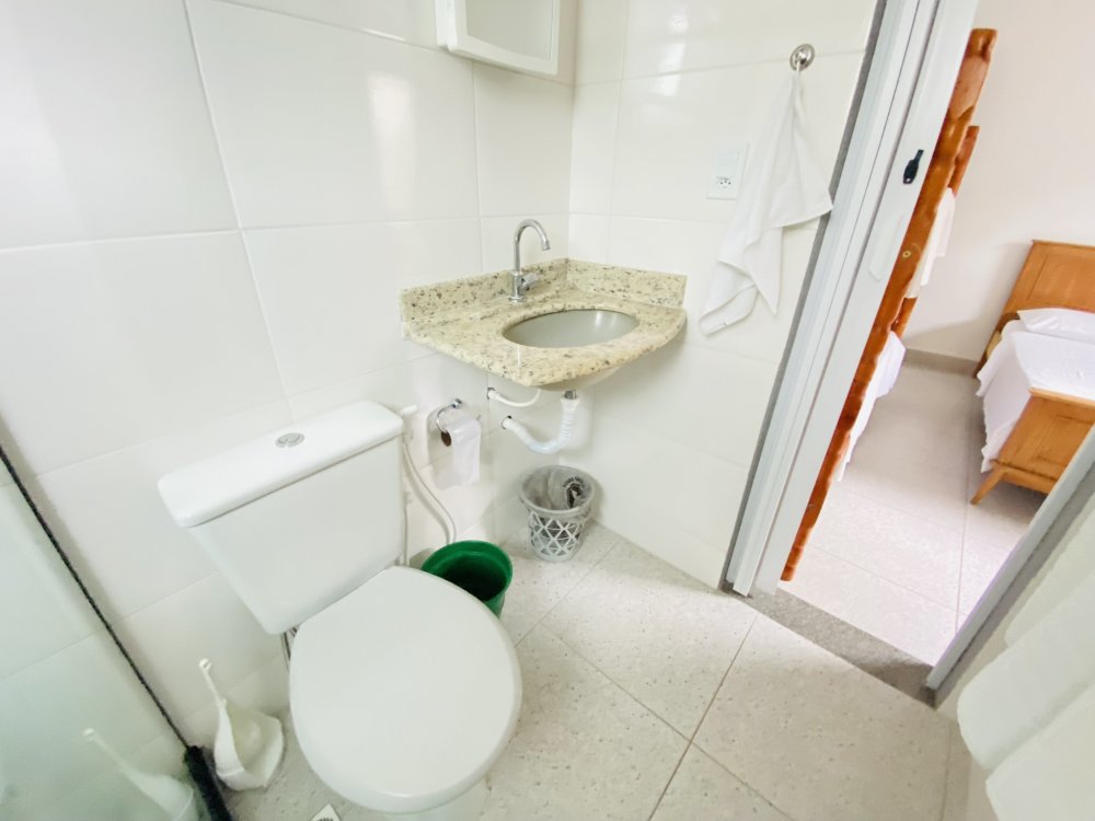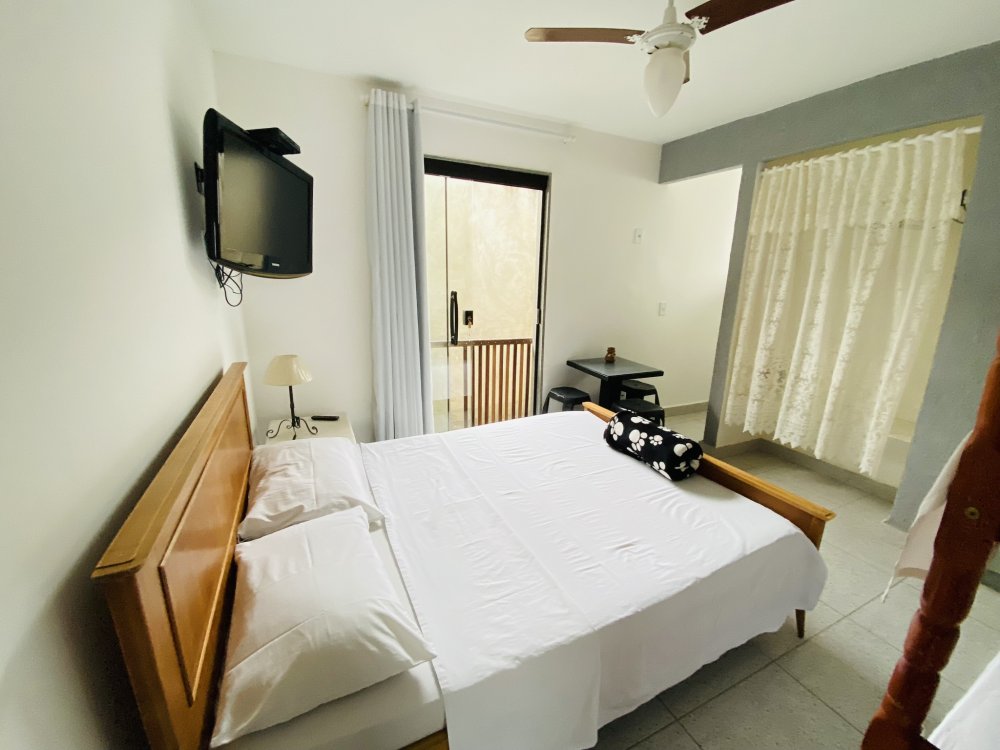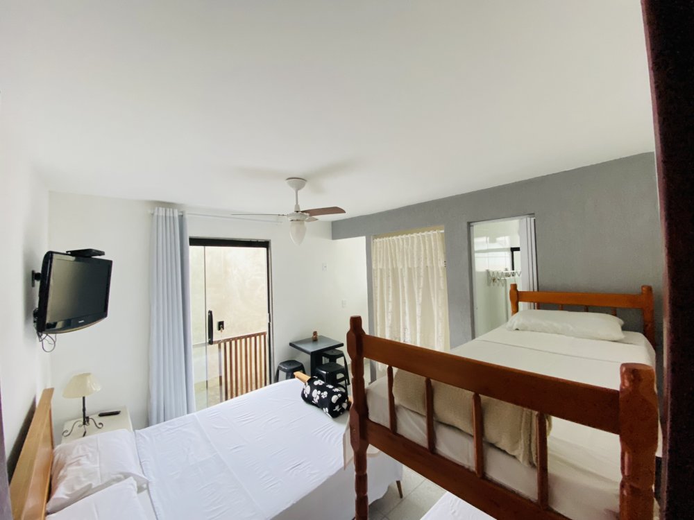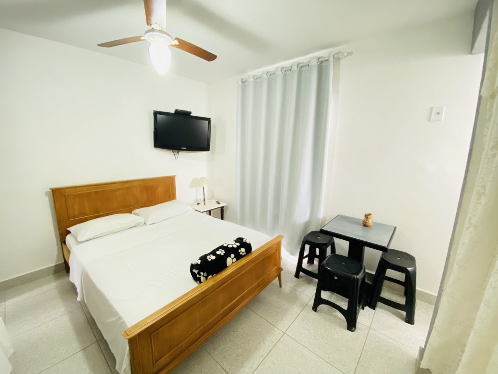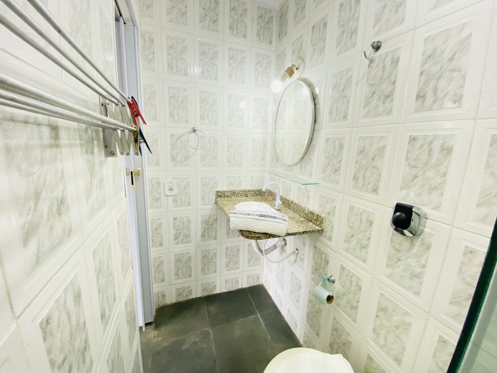 Pequeno Studio, piso frio, com 1 cama de casal, 1 beliche, tv e ventilador de teto. Cozinha integrada com geladeira, fogão, utensílios básicos, microondas. Banheiro confortável e reformado, com chuveiro elétrico, box com blindex. Wi Fi