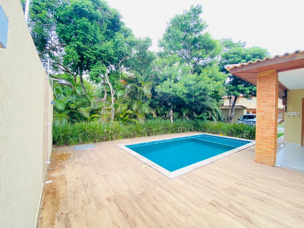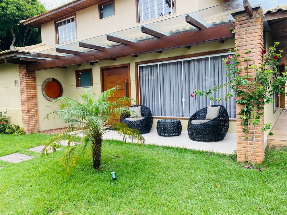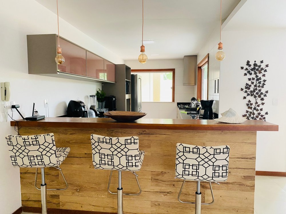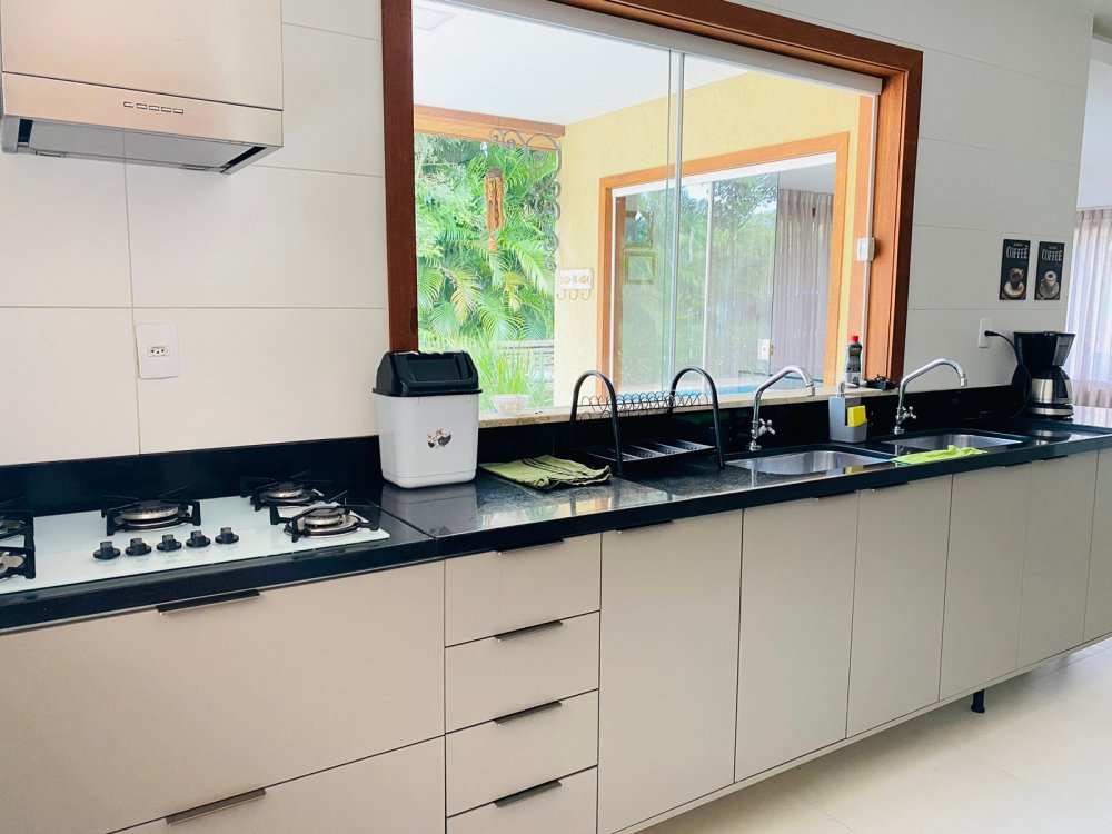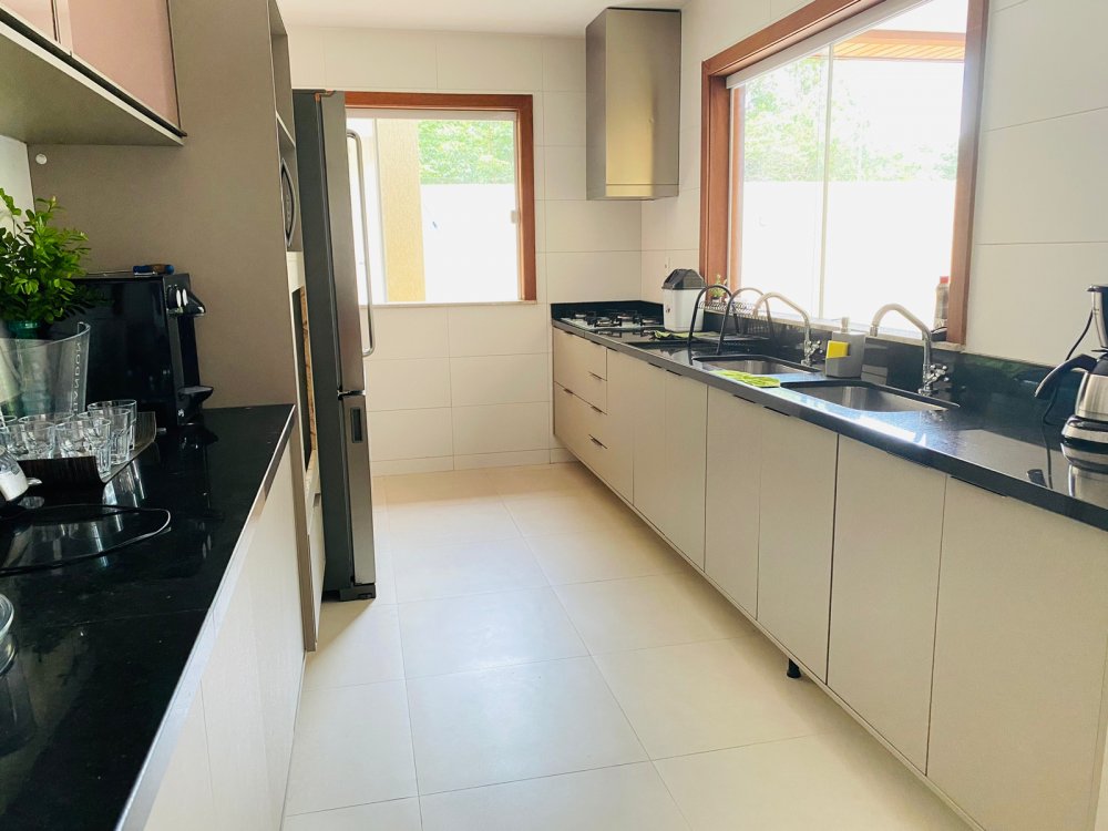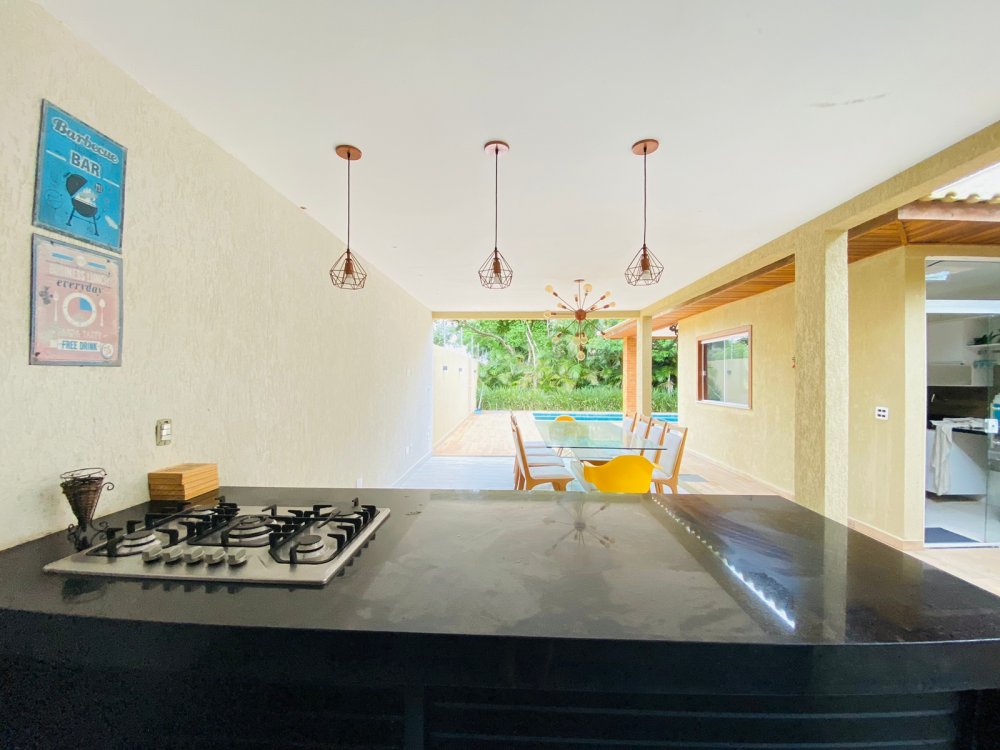 Lindíssima casa, muito bem cuidada, toda equipada, com 4 suites, sendo duas no térreo e duas no segundo pavimento, todas com enxoval completo e ares condicionados, cozinha completa com todos utensílios necessários, cook top, forno elétrico, panela de arroz, liquidificador, microondas, geladeira , airfry e louças. Area gourmet junto a piscina com churrasqueira e mesa de jantar. Lavanderia, duas vagas na garagem e ótima estrutura do condomínio com piscina ,sauna e um lindo lago com peixinhos