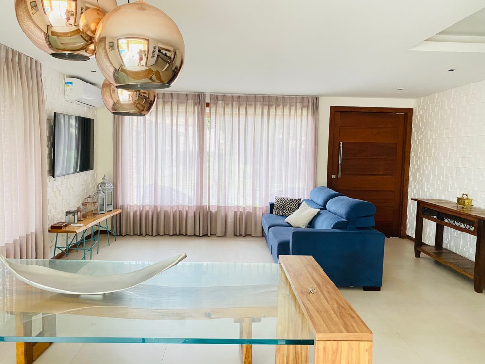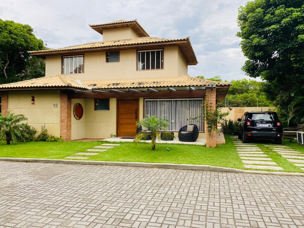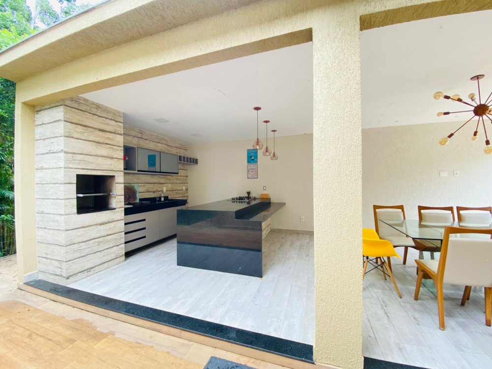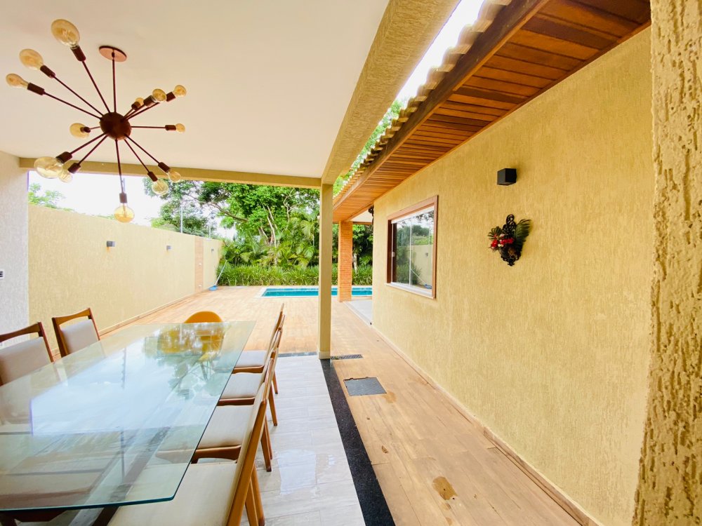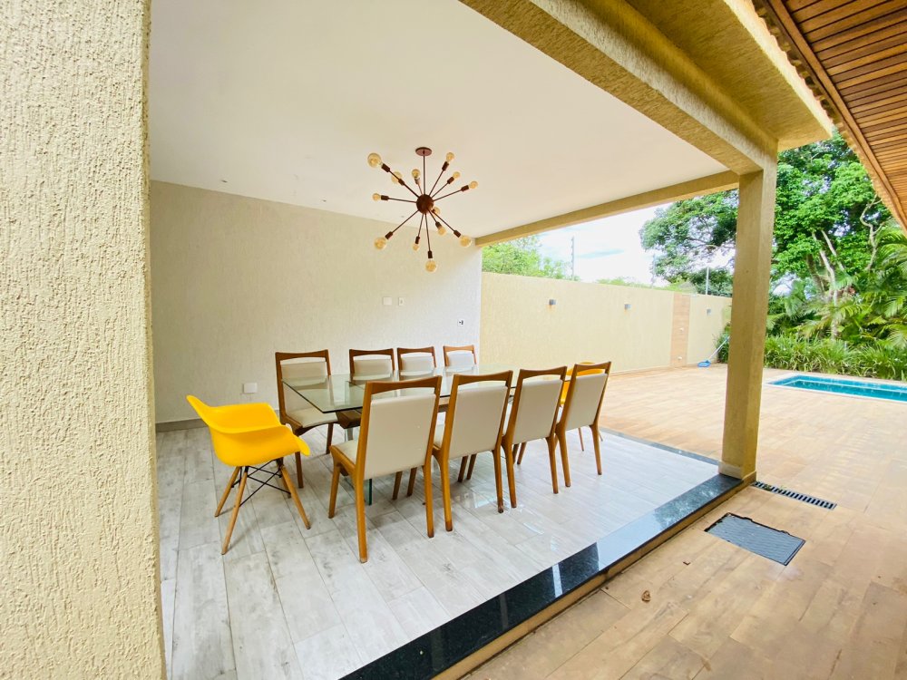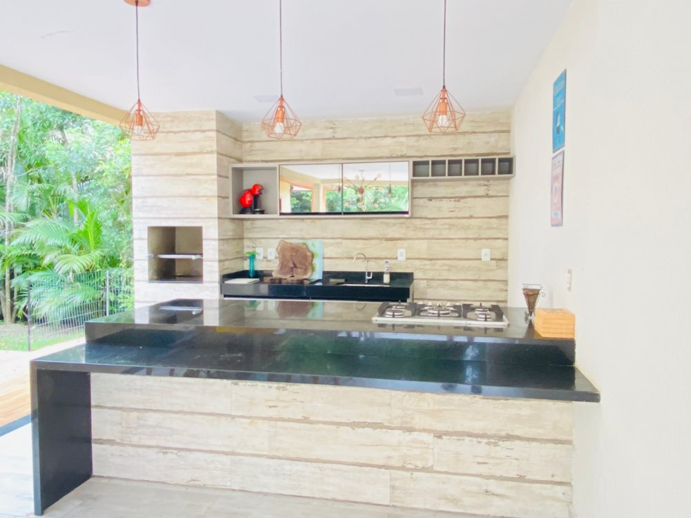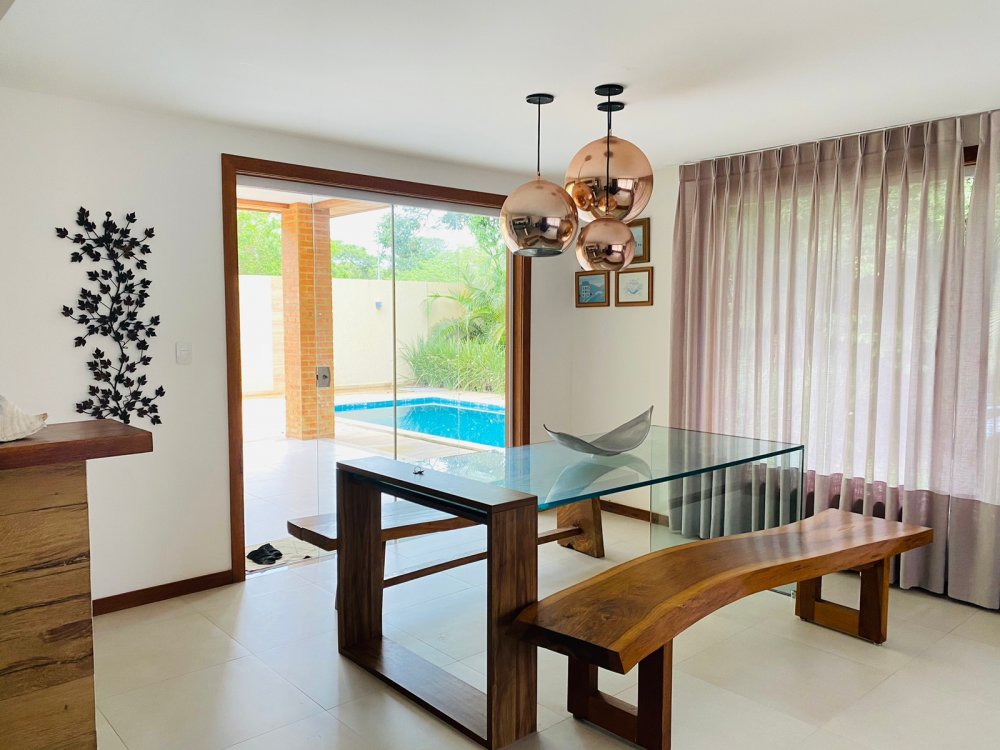 Lindíssima casa, muito bem cuidada, toda equipada, com 4 suites, sendo duas no térreo e duas no segundo pavimento, todas com enxoval completo e ares condicionados, cozinha completa com todos utensílios necessários, cook top, forno elétrico, panela de arroz, liquidificador, microondas, geladeira , airfry e louças. Area gourmet junto a piscina com churrasqueira e mesa de jantar. Lavanderia, duas vagas na garagem e ótima estrutura do condomínio com piscina ,sauna e um lindo lago com peixinhos