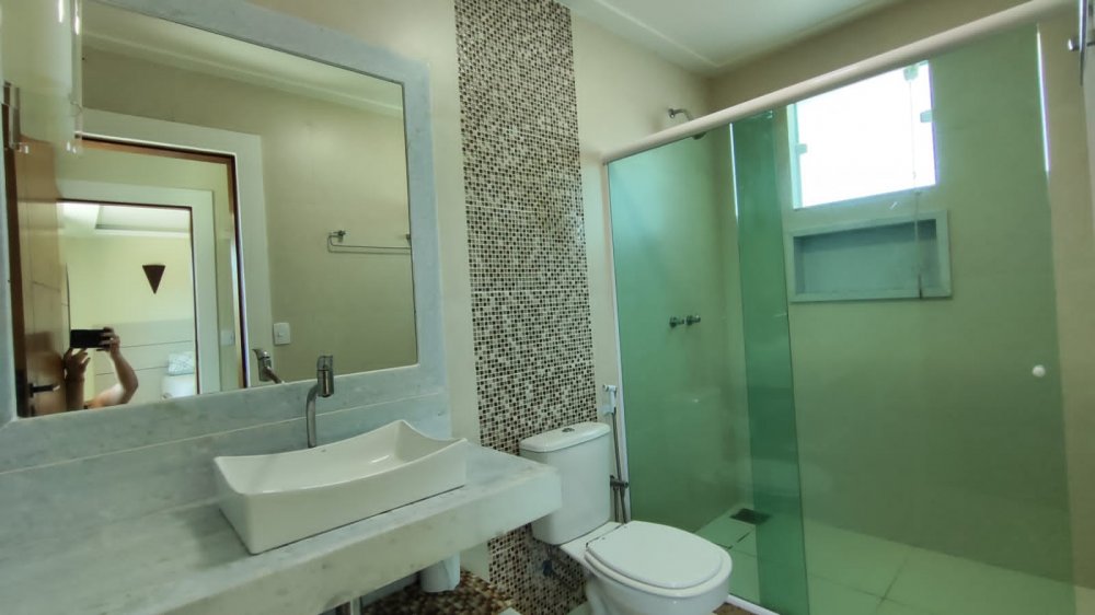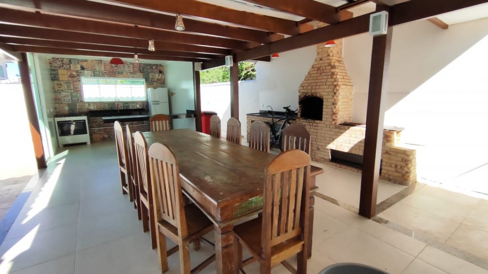 Casa com 3 suítes sendo duas no andar de baixo e uma no de cima , área gourmet junto a piscina com mesa de jantar, chuveiro externo, garagem para 1 carro, sistema de aquecimento solar.