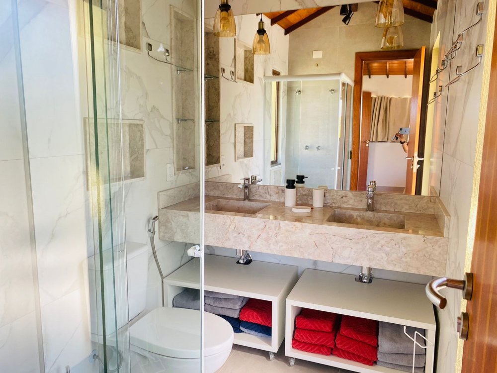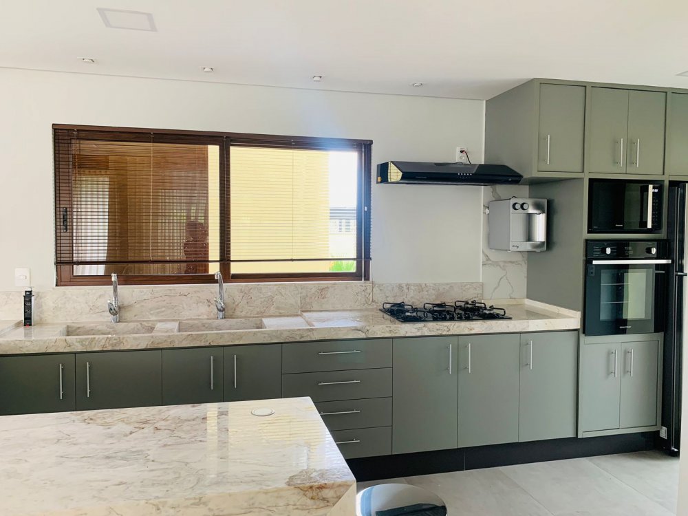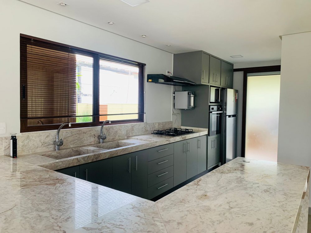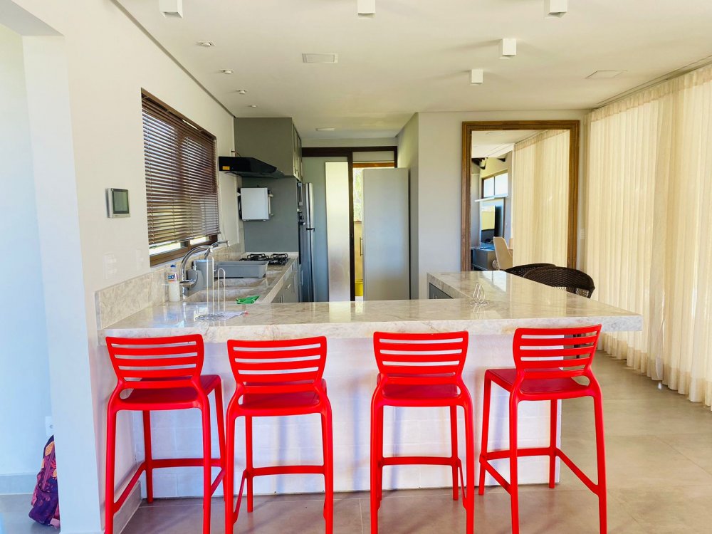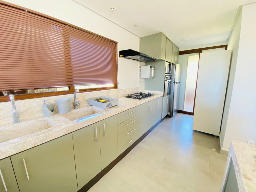 No piso inferior temos uma suíte completa também, lavabo, jardim de inverno , sala de tv de 70 " e cozinha em conceito aberto, toda equipada com filtro, microondas, geladeira, cafeteira e tudo para cozinhar.