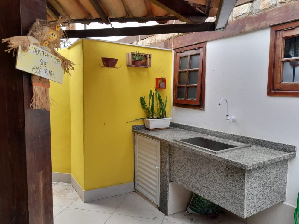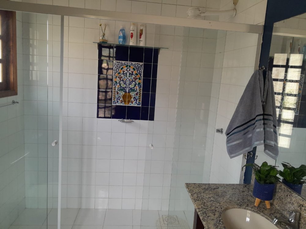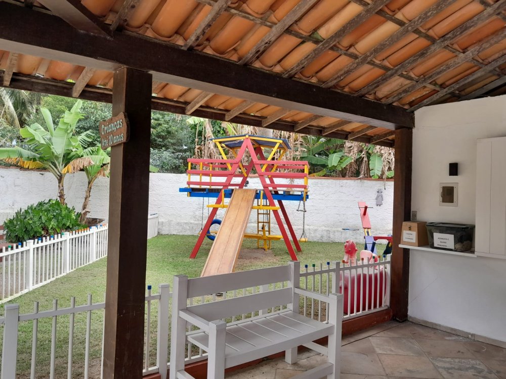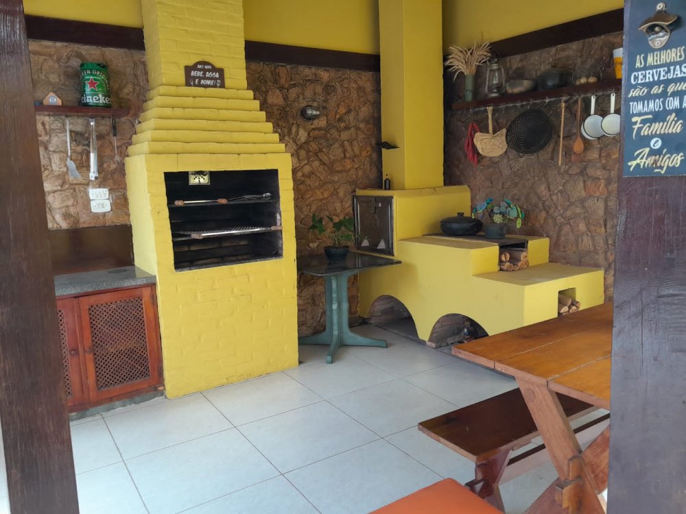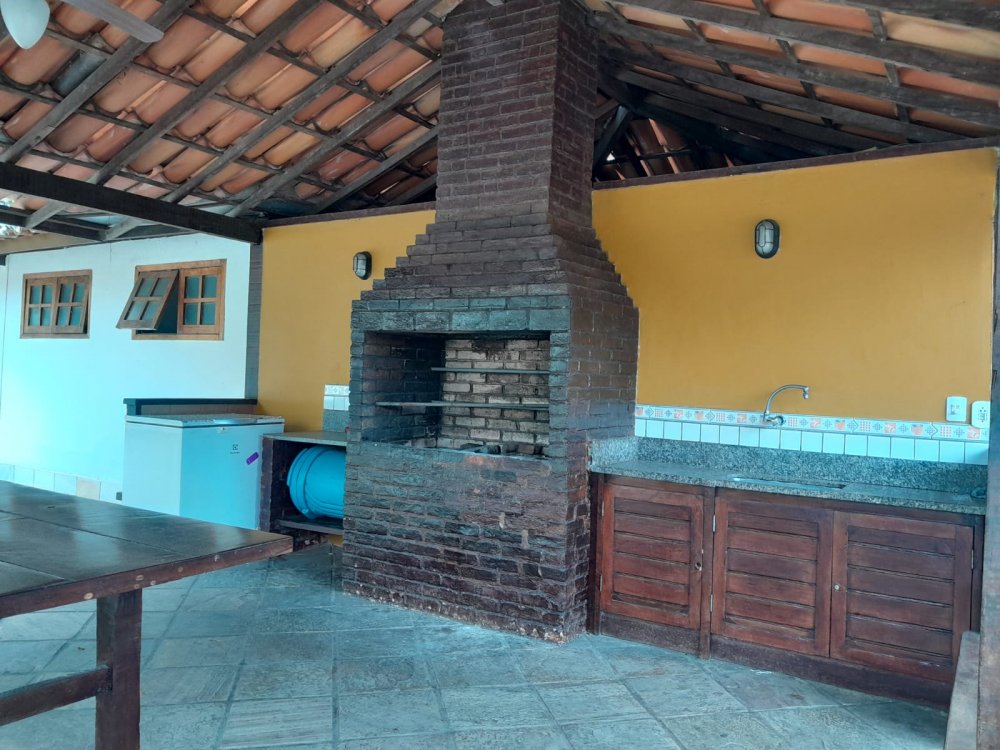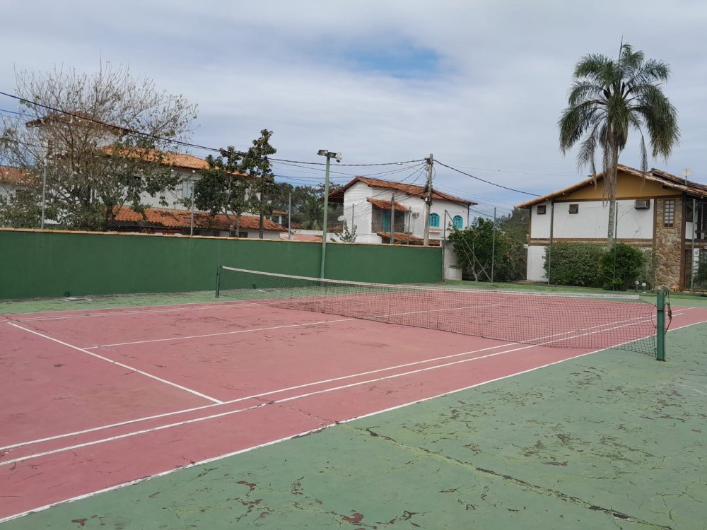 A casa possui área com churrasqueira, fogão a lenha e forno a lenha privativos. O condomínio oferece lazer completo com piscina, sauna, quadras, salão de jogos e restaurante.